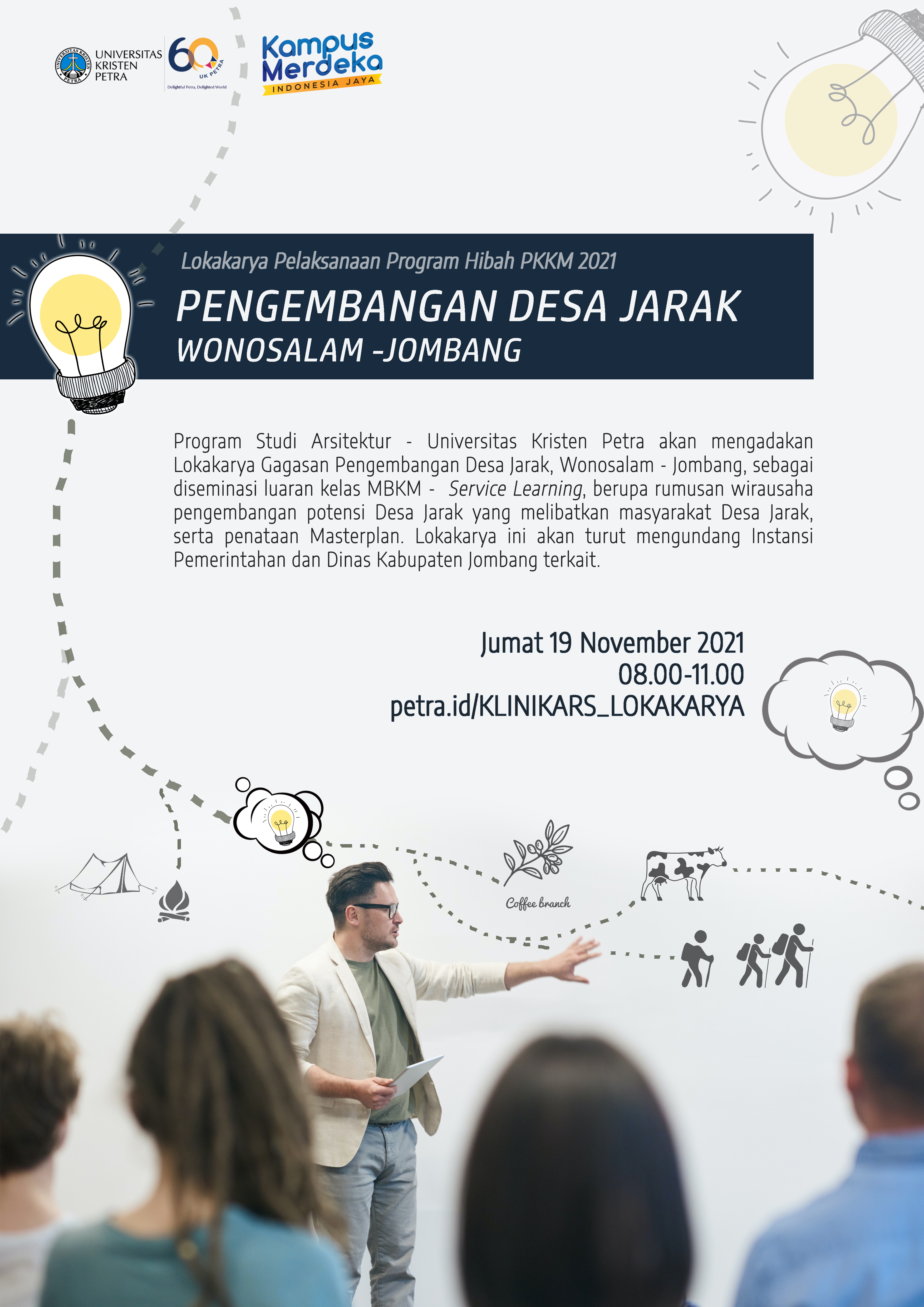 Program Studi Teknik Arsitektur UK Petra Surabaya pada tanggal 19 November 2021 jam 08.00 - 11.00 WIB akan mengadakan Lokakarya pelaksanaan dana hibah PKKM 2021. dalam lokakarya ini akan dimunculkan ide-ide gagasan berupa pengembangan desa Jarak, Wonosalam kabupaten Jombang. Untuk informasi lebih lanjut silahkan hubungi petra.id/KLINIKARS_LOKAKARYA.