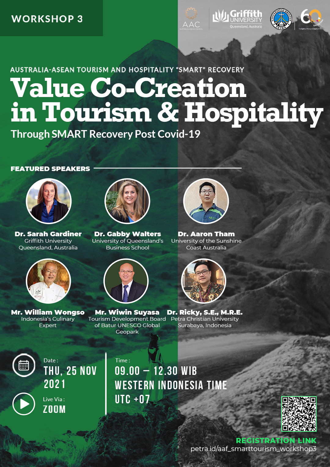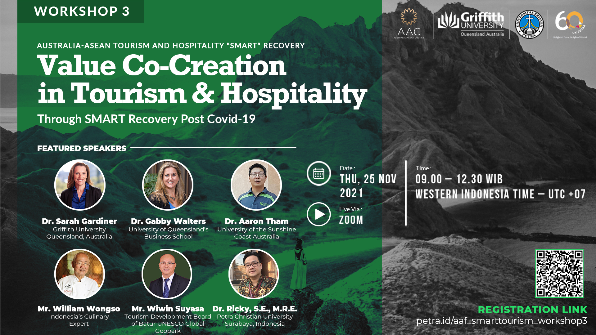 Workshop tentang tourism dan hospitality akan dilaksanakan oleh Fakultas Ekonomi UK Petra pada tanggal 25 November 2021 jam 09.00 - 12.30 WIB. Workshop 3: Australia-Asean tourism and hospitality "smart" recovery: Value co-creation in tourism and hospitality ini mengundang beberapa pembicara seperti Dr. Sarah Gardiner, Dr. Gabby Walters, Dr. Aaron Tham, William Wongso, Wiwin Suyasa serta Dr. Ricky. Diadakan secara daring melalui aplikasi Zoom. Untuk pendaftaran silahkan dilihat di http://petra.id/aaf_smarttourism_workshop3