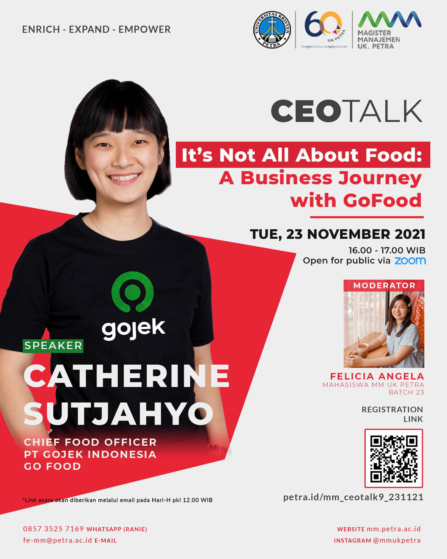 Pada tanggal 23 November 2021 jam 16.00 - 17.00 WIB, dengan menggunakan aplikasi Zoom, Program Stui Magister Manajemen Universitas Kristen Petra Surabaya akan mengadakan acara CEO Talk dengan topik " it's not all about food: a business journey with GoFood". Sebagai narasumber dalam acara ini yaitu Catherine Sutjahyo dari PT Gojek Indonesia.