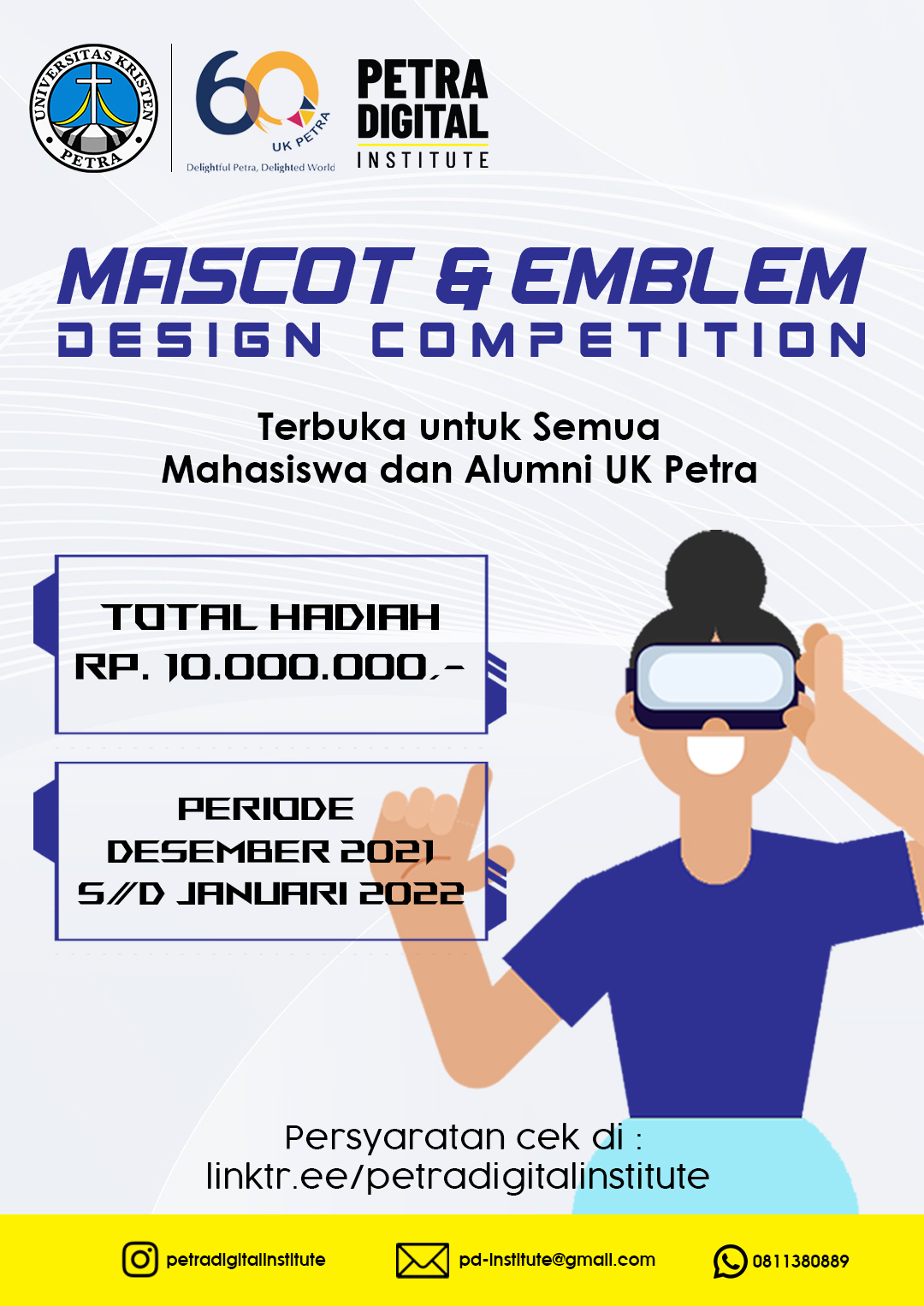 Lomba mendesign maskot dan 5 emblem untuk Petra Digital Institute diadakan oleh Universitas Kristen Petra Surabaya. Terbuka untuk sivitas UK Petra dengan total hadiah Rp.10.000.000.,informasi lebih lengkap ada di link: linktr.ee/petradigitalinstitute