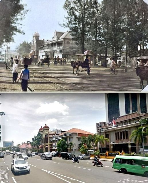 Foto dulu dan sekarang, Aloon-Aloonstraat te Soerabaja, pada tahun 1920, dan jalan Pahlawan Surabaya, pada tahun 2018