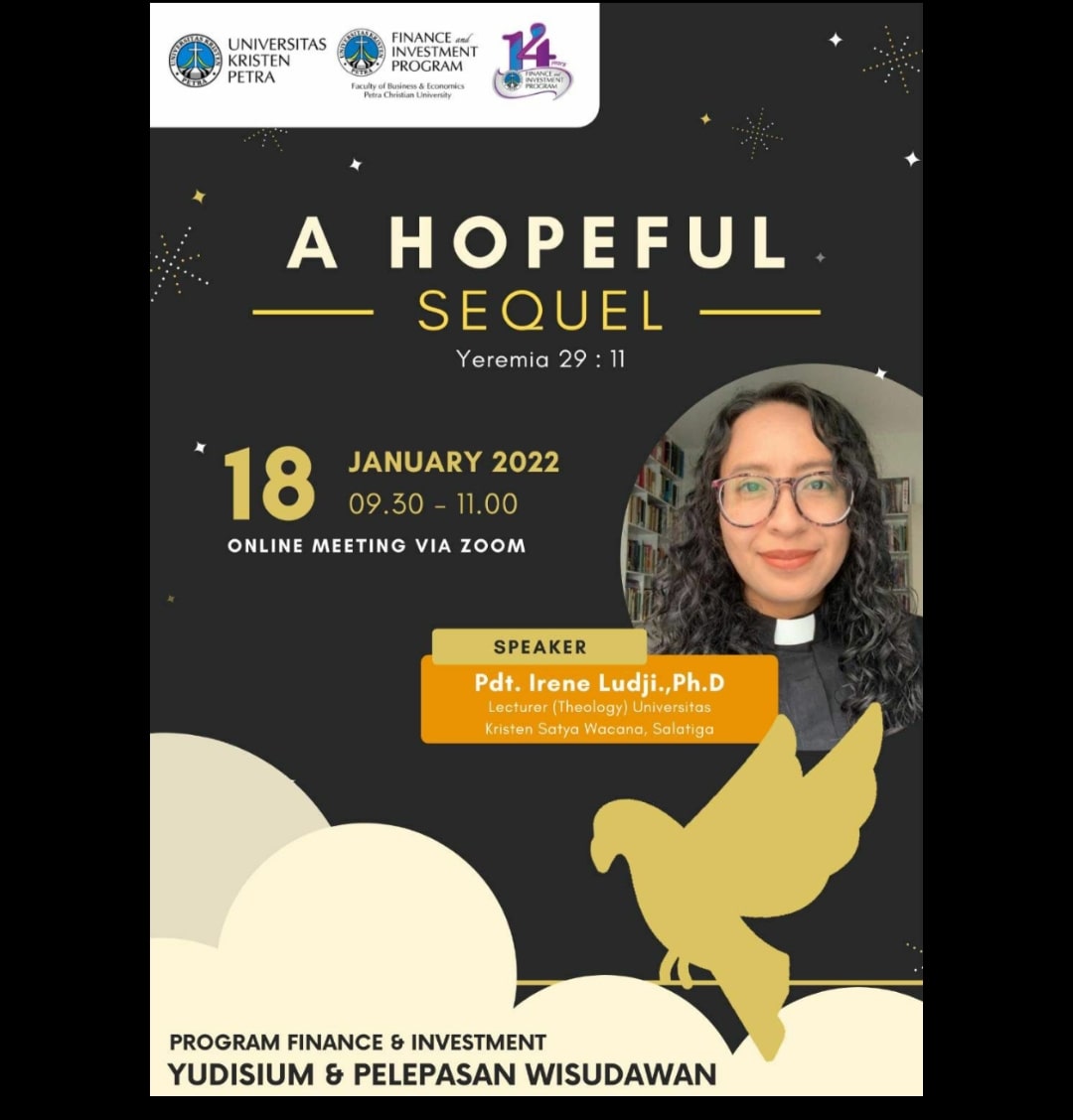 Program Manajemen Keuangan Universitas Kristen Petra Surabaya pada tanggal 18 Januari 2022 jam 09.30. - 11.00 WIB, mengadakan kebaktian pelepasan bagi mahasiswa Manajemen Keuangan yang diwisuda. Dengan pengkhotbah Pdt. Irene Ludji, Ph.D. acara ini berlangsung secara online melalui aplikasi Zoom.