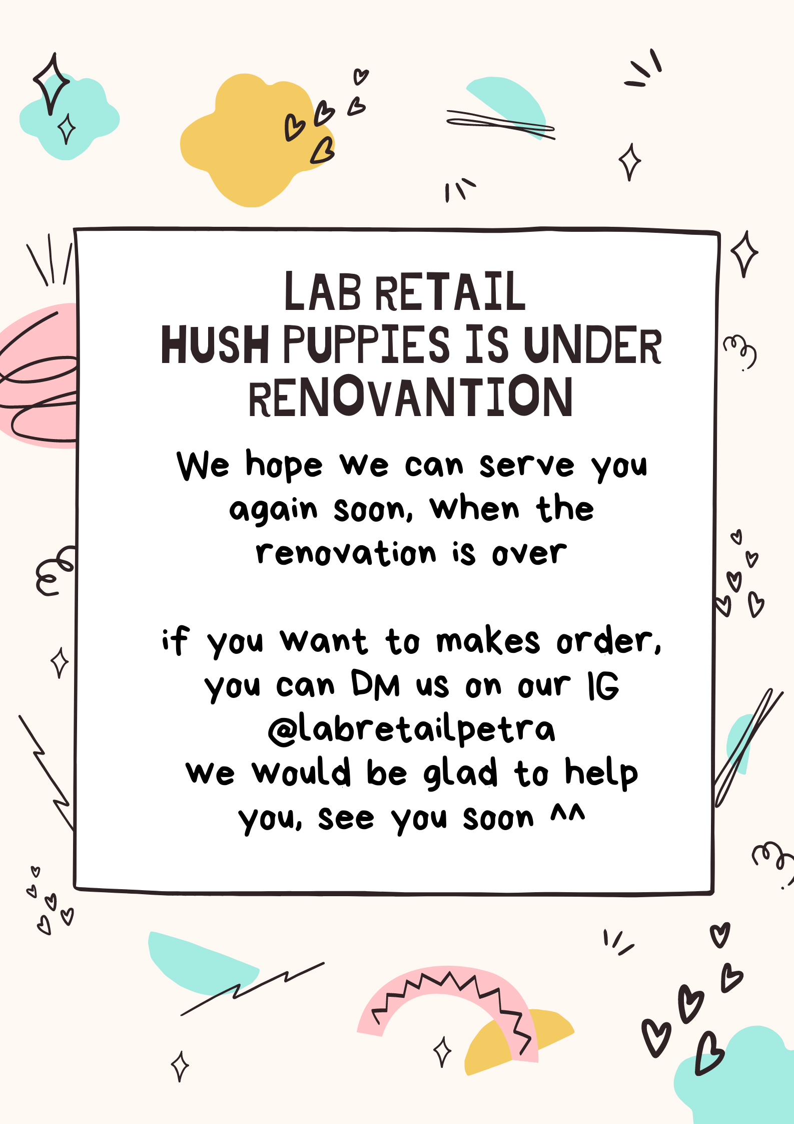 Sehubungan dengan adanya pekerjaan renovasi gedung laboratorium retail Manajemen Kepariwisataan UK Petra, maka untuk sementara waktu pelayanan di Laboratorium Retail ditutup. Pelayanan dibuka secara online melalui IG.