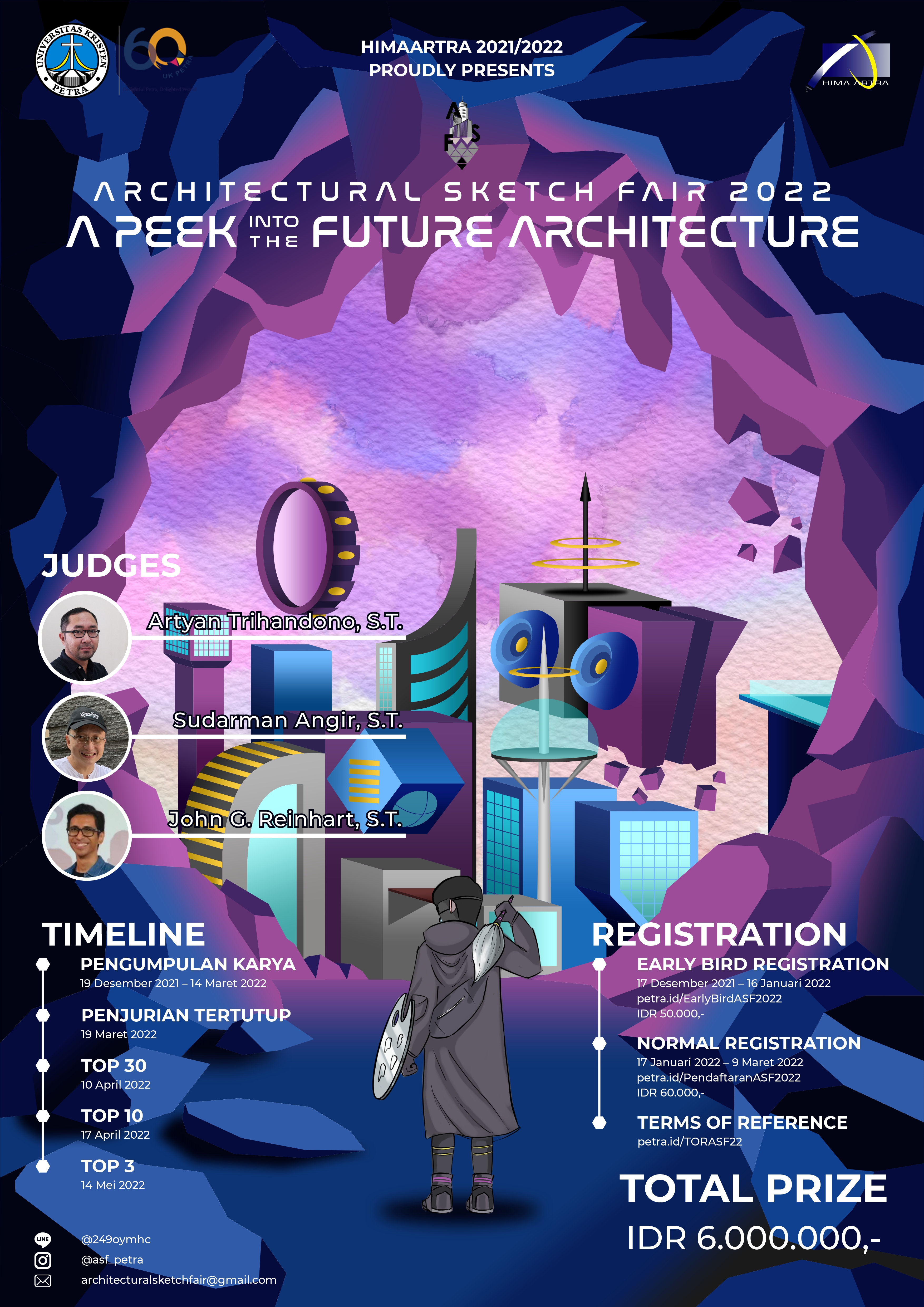 Architectural Sketch Fair 2022 merupakan kompetisi sketsa arsitektur nasional yang diselenggarakan oleh Himpunan Mahasiswa Arsitektur UK Petra. Pada tahun ini, ASF mengangkat tema "A Peek Into The Future Architecture". Are you ready? Get your Future Glasses on and make your Vision come true! Untuk pendaftaran dibuka dari 19 Desember 2021 hingga 14 Maret 2022. Dengan memperebutkan total hadiah Rp. 6.000.000. Lomba dibuka untuk mahasiswa arsitektur di seluruh Indonesia.