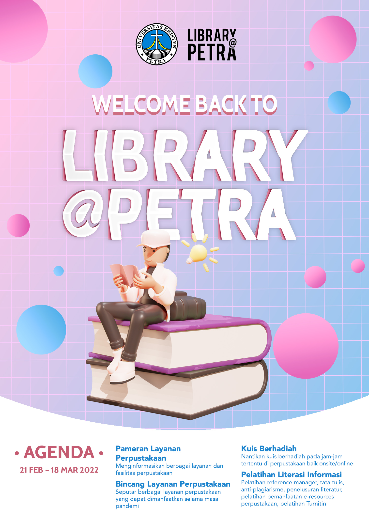 Berbagai kegiatan di Perpustakaan untuk menyambut mahasiswa mengawali perkuliahan semester baru pada tahun 2022.