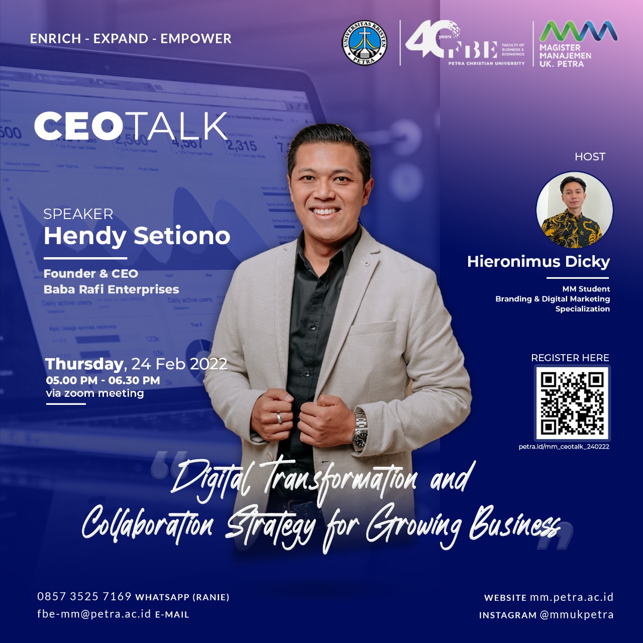 Magister Manajemen Universitas Kristen Petra Surabaya pada tanggal 24 Februari 2022 jam 17.00-18.30 WIB mengadakan acara CEO Talk Magister Management: digital transformation and collaboration strategy for growing business. Dengan narasumber Hendy Setiono CEO Baba Rafi Enterprises. Acara ini dilangsungkan secara online mmelalui aplikasi Zoom Meeting.