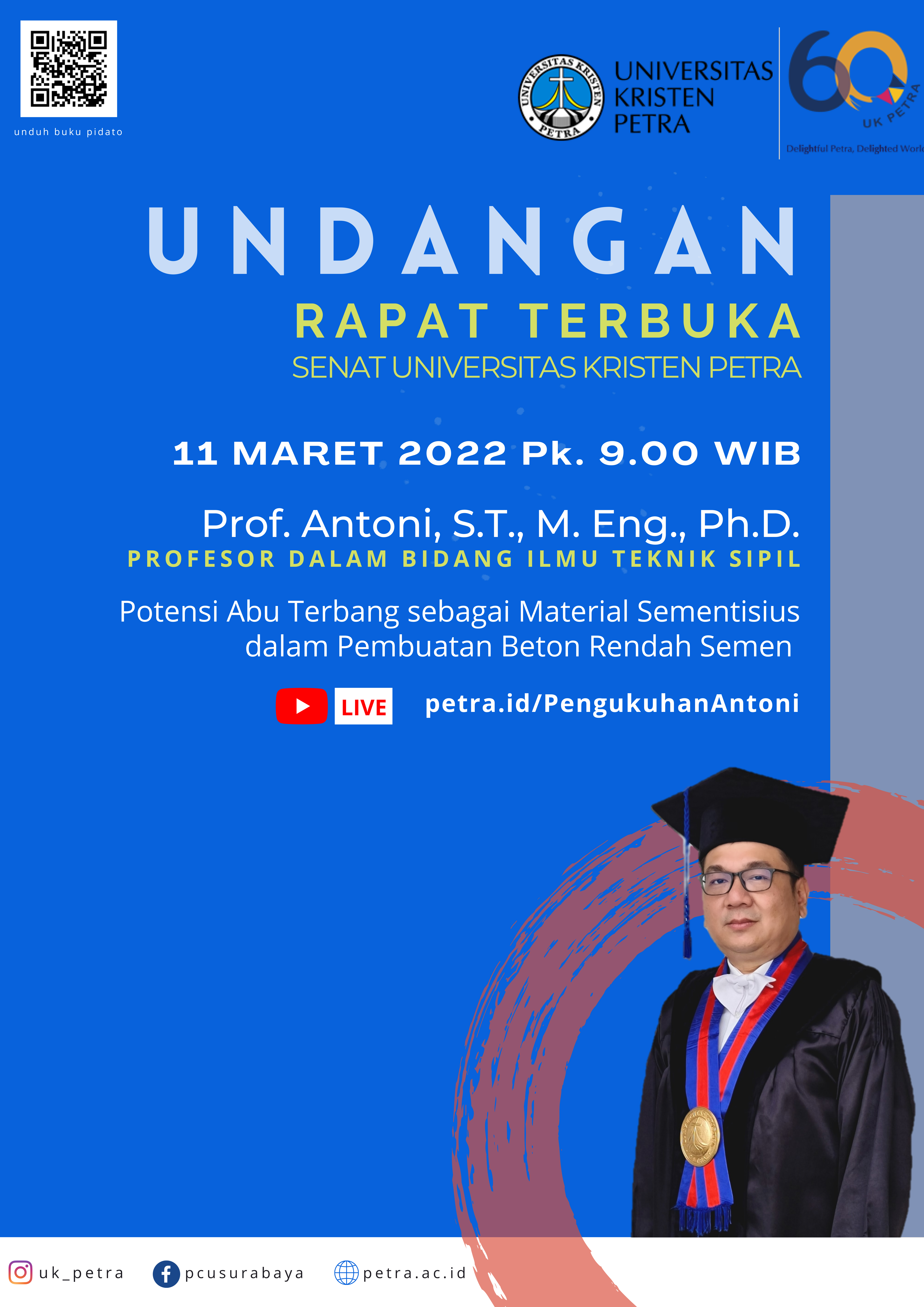Jumat, 11 Maret 2022 jam 09.00 - selesai bertempat di Auditorium gedung Q Universitas Kristen Petra Surabaya akan dilaksanakan pengukuhan guru besar Fakultas Teknik Sipil dan Perencanaan UK Petra, Profesor Antoni, S.T., M.Eng., Ph.D. Acara ini dilaksanakan secara online melalui kanal Youtube: petra.id/PengukuhanAntoni.