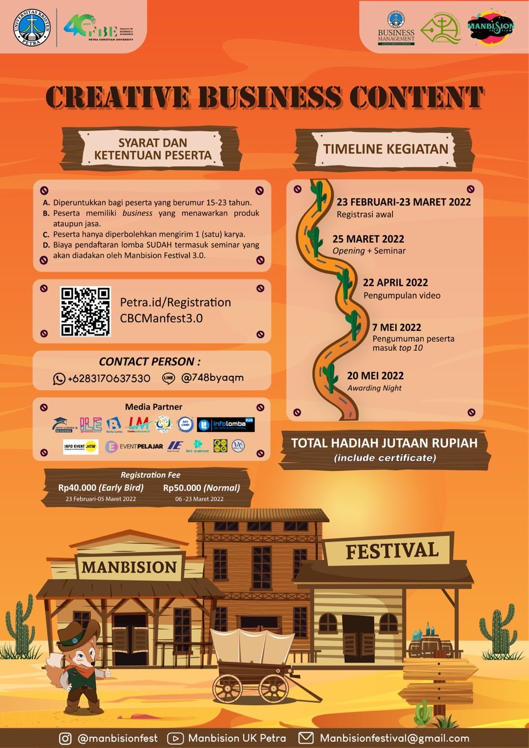 Salah satu acara yang diadakan Manajemen Bisnis UK Petra didalam memeriahkan Manbision Festival 2022 adalah lomba "Creative business content". Lomba ini diperuntukkan untuk peserta berusia 15-23 tahun dan memiliki bisnis sendiri. Untuk keterangan lebih lanjut silahkan klik Petra.id/RegistrationCBCManfest3.0