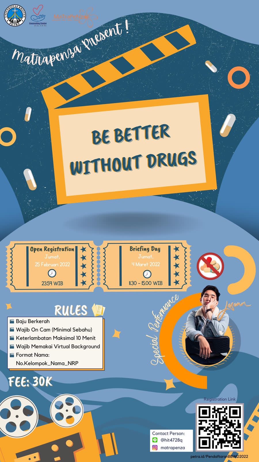 UKM Matrapenza bekerja sama dengan PKPP Universitas Kristen Petra Surabaya mengadakan acara kampanye Matrapenza "Be Better Without Drugs". Dengan narasumber Jensenn acara ini dilaksanakan pada 04 Maret 2022 jam 11.30 - 15.00 WIB. Untuk info lebih lengkap bisa dilihat di petra.id/PendaftaranBBWD2022.