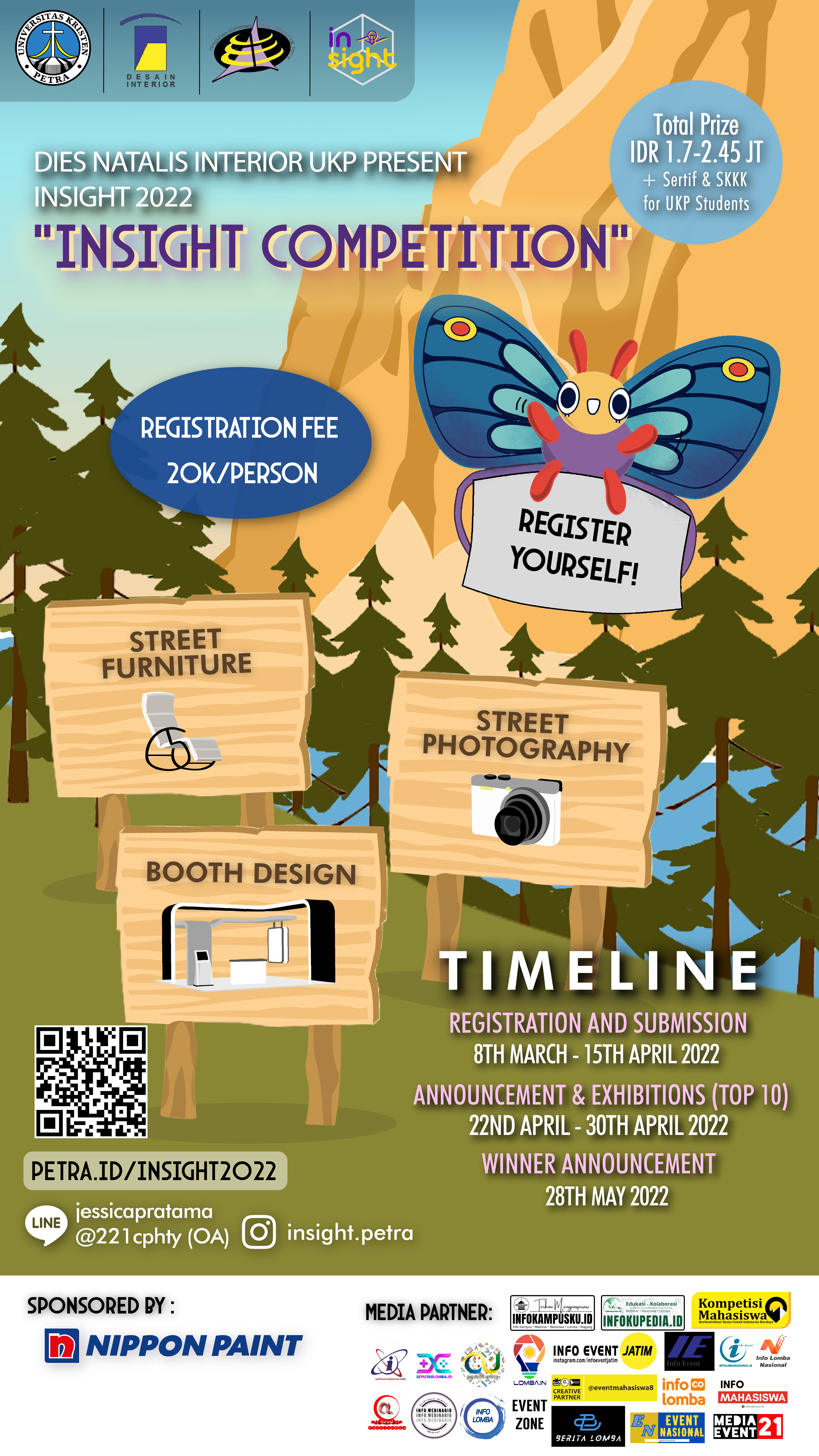 Program Studi Desain Interior Universitas Kristen Petra Surabaya kembali mengadakan acara "Insight Competition". Berbagai macam lomba akan dilaksanakan pada acara ini. Untuk info lengkap silahlkan dilihat link petra.id/insight2022