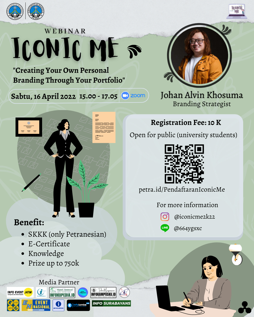 Kegiatan Webinar Iconic Me adalah program kerja dari departemen Public Relation and Partnership Badan Eksekutif Mahasiswa UK Petra periode 2021/2022 yang bertujuan untuk memberikan edukasi mengenai personal branding kepada mahasiswa aktif di Indonesia. Kegiatan acara ini dikemas dalam 3 bentuk kegiatan yaitu tes bakat minat yang diadakan saat registration, lalu dilanjutkan dengan webinar pada tanggal 16 April 2022 pada pukul 15.00 WIB sampai selesai dengan sesi games, penyampaian materi, dan sesi tanya jawab, sehingga harapannya mampu menyadarkan dan memberikan wawasan baru kepada mahasiswa di Indonesia mengenai pentingnya untuk memiliki personal branding yang tepat agar dapat bermanfaat bagi karir mereka selanjutnya.
