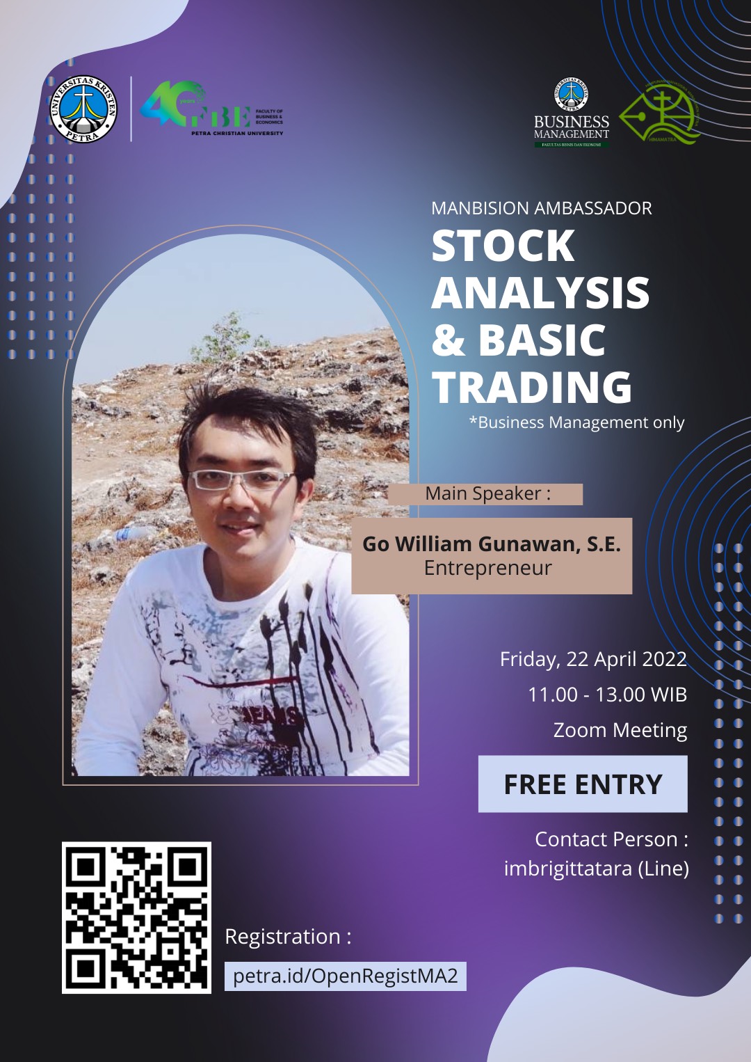 Webinar Manbision Ambassador: stock analysis and basic trading, akan dilaksanakan oleh Program Manajemen Bisnis UK Petra Surabaya, pada tanggal 22 April 2022 Jam 11.00 - 13.00 WIB. Dengan narasumber Go William Gunawan, S.E. Acara ini dilakukan secara daring melalui aplikasi Zoom Meeting.