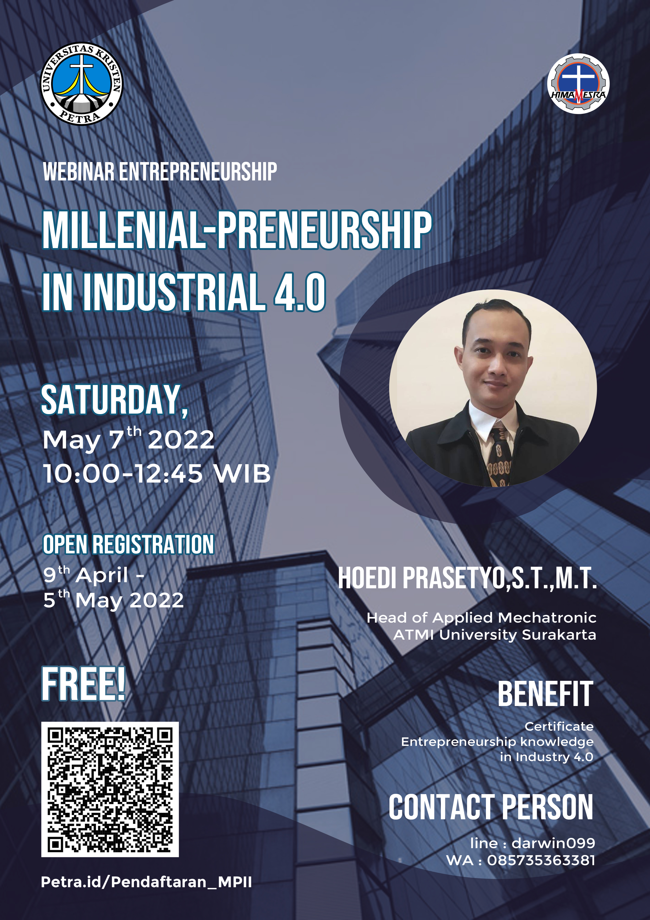 Webinar Millenial-Preneurship 2022, akan diadakan pada: Sabtu, 7 Mei 2022. Pukul: 10.00-12.45 WIB. Oleh Program Studi Teknik Mesin UK Petra, dengan narasumber bapak Hoedi Prasetyo, S.T., M.T.