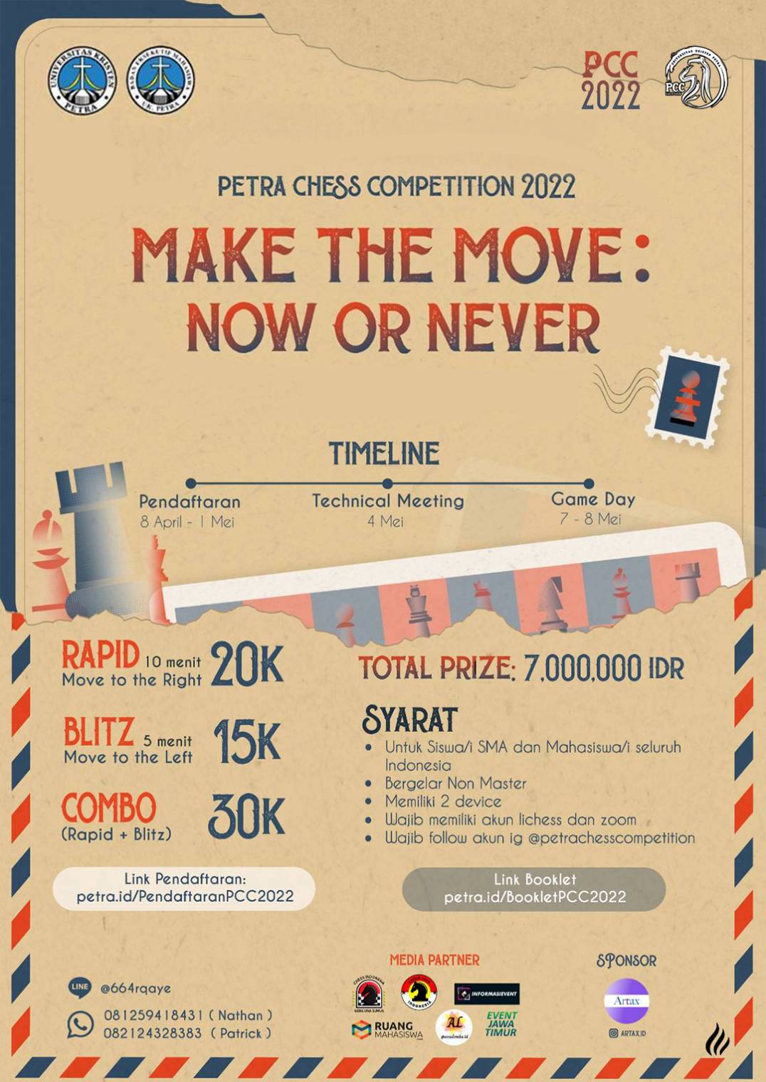 Petra Chess Competition merupakan lomba catur nasional se-Indonesia. Pada tahun ini, Petra Chess Competition membawa tema Make the Move : Now or Never. Kami ingin mengajak setiap orang yang tertarik bermain catur untuk berani mengambil bidak dan make the move (mengambil langkah) bertanding di tingkat nasional sekarang atau tidak sama sekali.