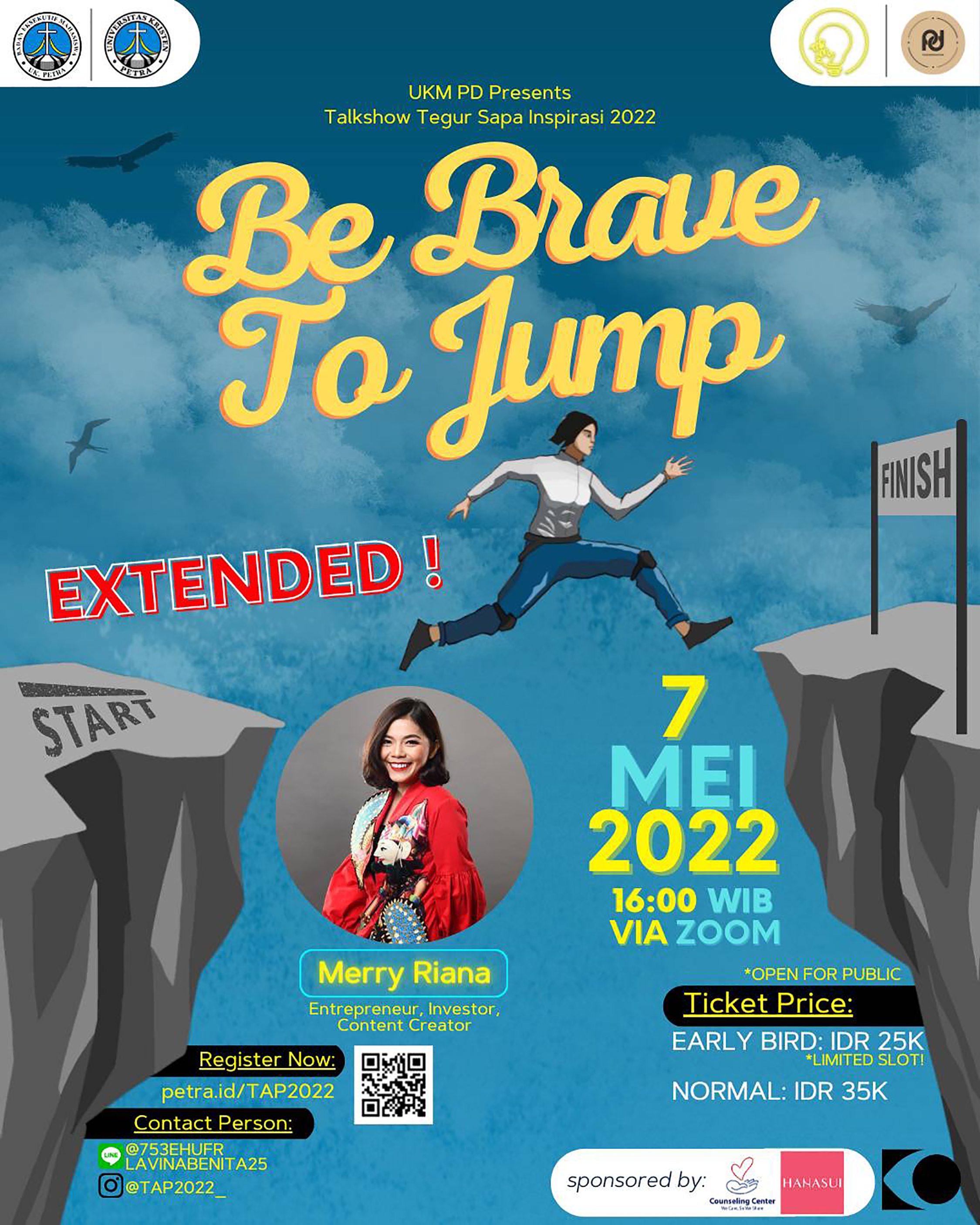Badan Eksekutif Mahasiswa UK Petra mengadakan acara talkshow Tegur Sapa Inspirasi 2022 dengan topik "Be Brave To Jump". Dengan narasumber Merry Riana, acara ini diselenggarakan pada tanggal 07 Mei 2022, jam 16.00 WIB.,diselenggarakan secara online melalui aplikasi Zoom.