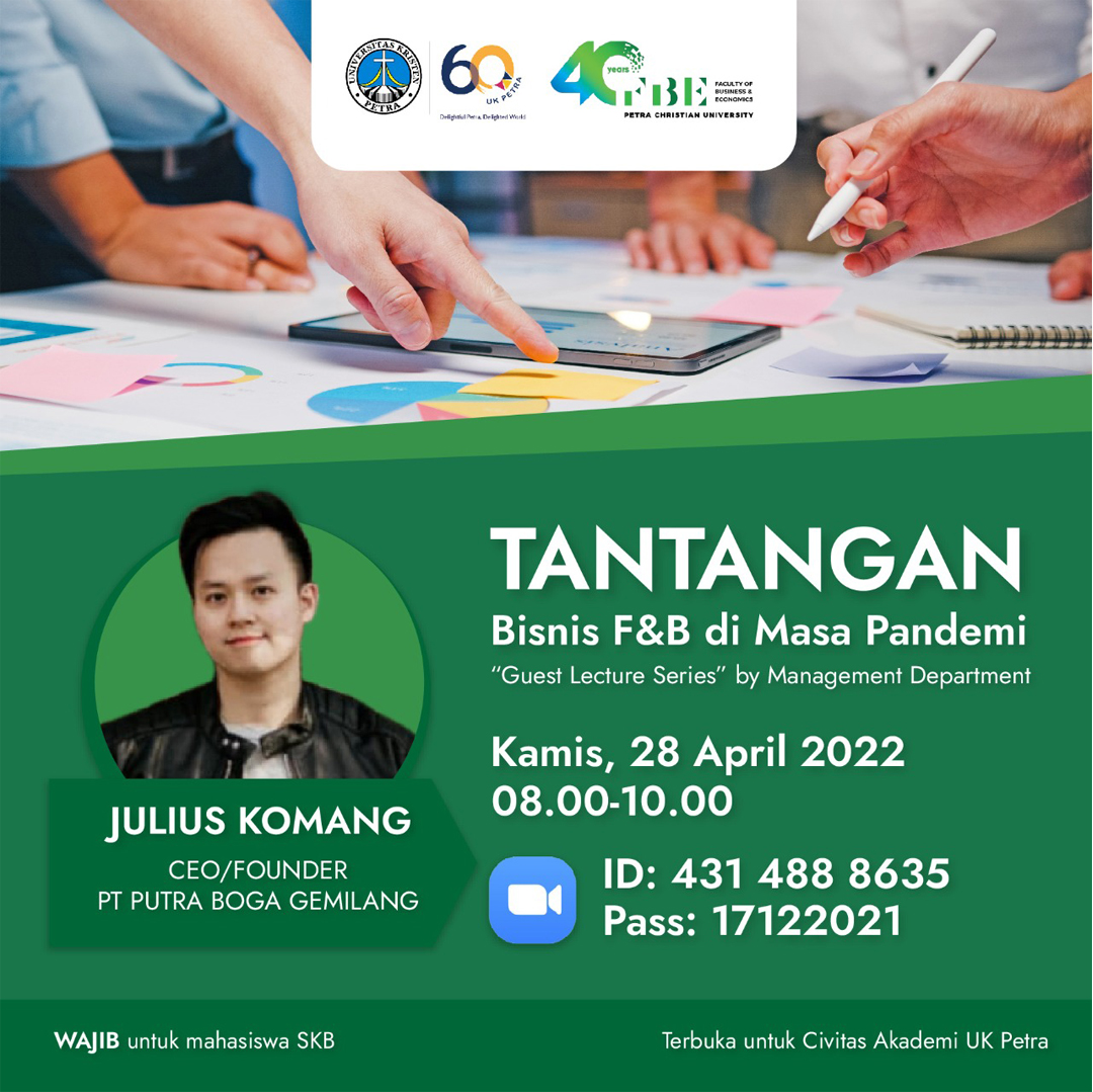 Manajemen Perhotelan UK Petra pada Kamis, 28 April 2022 jam 08.00 - 10.00 WIB, mengadakan acara Kuliah Tamu dengan narasumber Julius Komang. Dengan mengangkat topik "Tantangan bisnis F&B di masa pandemi", acara ini diselenggarakan secara online melalui aplikasi Zoom.