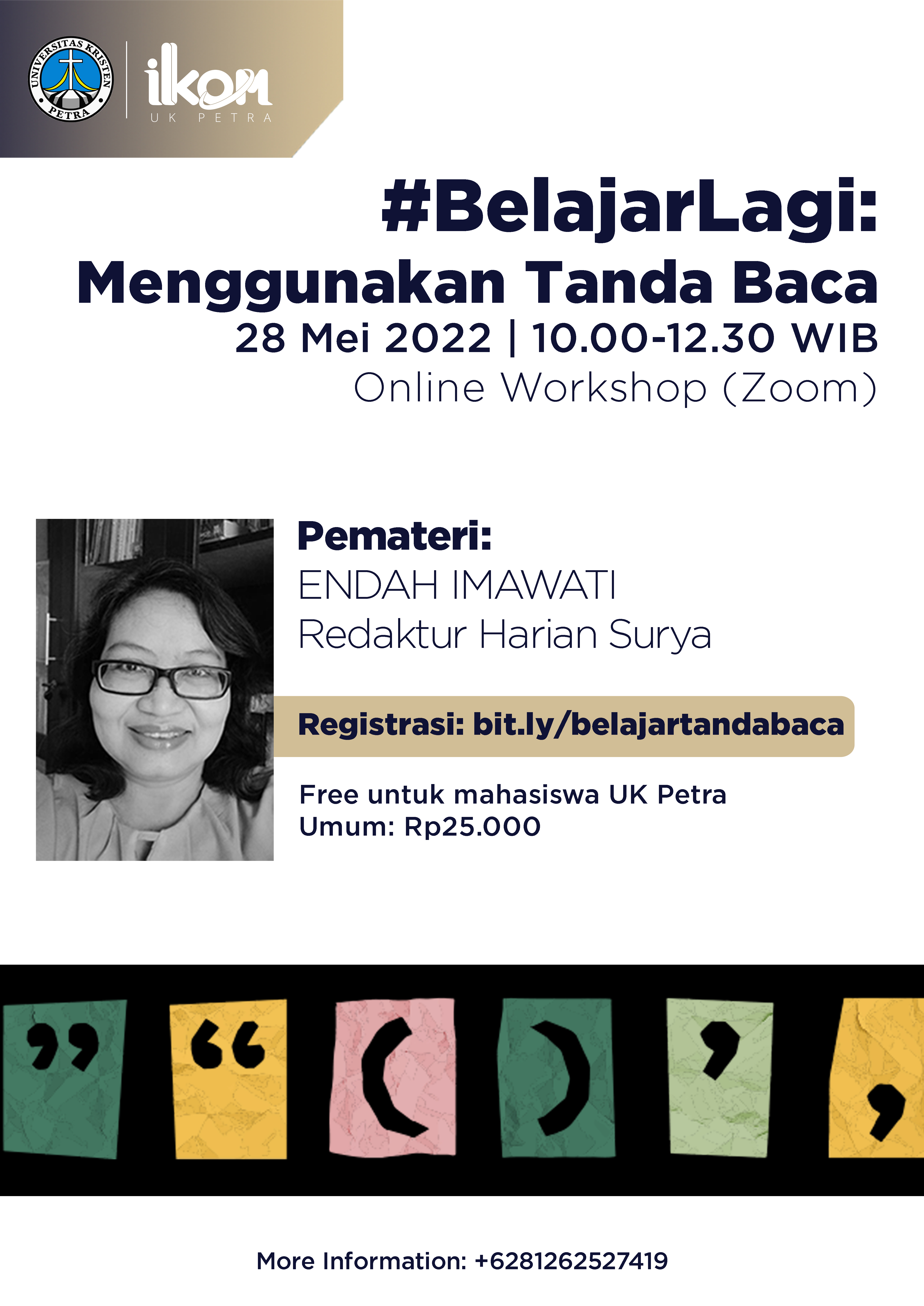 Program Studi Ilmu Komunikasi UK Petra Surabaya pada tanggal 28 Mei 2022 jam 10.00 - 12.300 WIB, mengadakan workshop dengan tema "Belajar lagi: menggunakan tanda baca". Dengan narasumber Endah Imawati redaktur harian Surya. Kegiatan ini diadakan secara online melalui aplikasi Zoom.