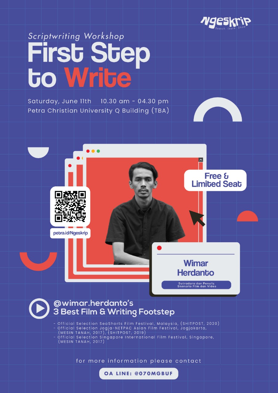 Workshop scriptwriting dengan topik "first step to write" berlangsung pada Sabtu 11 Juni 2022 pukul 10.30-16.30 di gedung Q UK Petra. Dengan narasumber Wimar Herdanto.