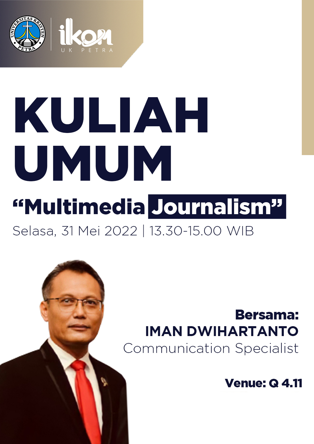 Program Studi Ilmu Komunikasi Universitas Kristen Petra Surabaya mengadakan kuliah umum "Multimedia Journalism" bersama Iman Dwihartanto. Kegiatan berlangsung pada tanggal 31 Mei 2022 pukul 13.30-15.30 WIB di Ruang 4.11 Gedung Q Universitas Kristen Petra Surabaya.