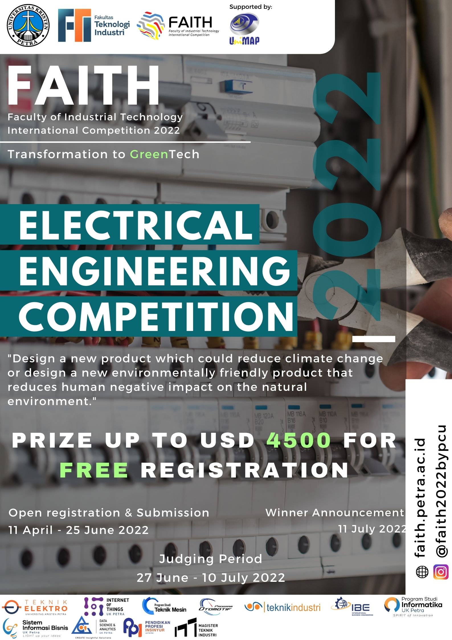 Salah satu rangkaian acara Faculty of Industrial Technology International Competition (FAITH 2022) yang diadakan oleh Fakultas Teknologi Industri Universitas Kristen Petra Surabaya adalah electrical engineering competition. Informasi lebih lengkap tentang acara ini bisa dilihat di www.faith.petra.ac.id