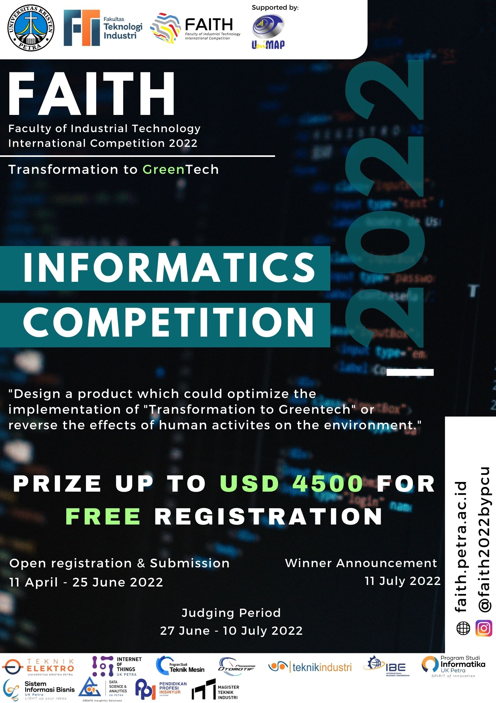 Salah satu rangkaian acara Faculty of Industrial Technology International Competition (FAITH 2022) yang diadakan oleh Fakultas Teknologi Industri Universitas Kristen Petra Surabaya adalah informatics competition. Informasi lebih lengkap tentang acara ini bisa dilihat di www.faith.petra.ac.id