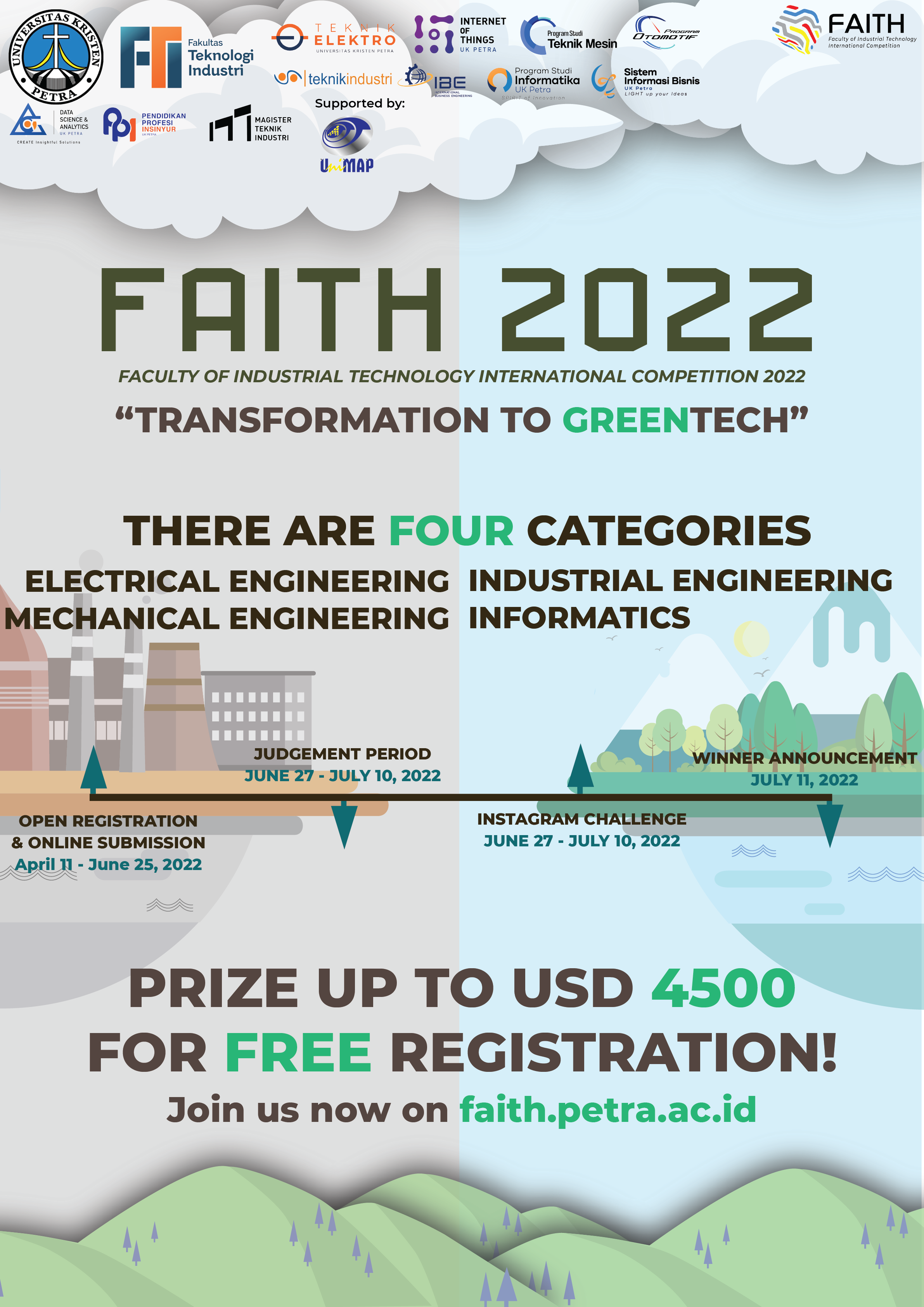 Rangkaian acara Faculty of Industrial Technology International Competition (FAITH 2022) diadakan oleh Fakultas Teknologi Industri Universitas Kristen Petra Surabaya, banyak lomba-lomba tingkat internasional diadakan seperti electrical engineering competition, mechanical engineering competition, industrial engineering competition, informatics competition. Informasi lebih lengkap tentang acara ini bisa dilihat di www.faith.petra.ac.id