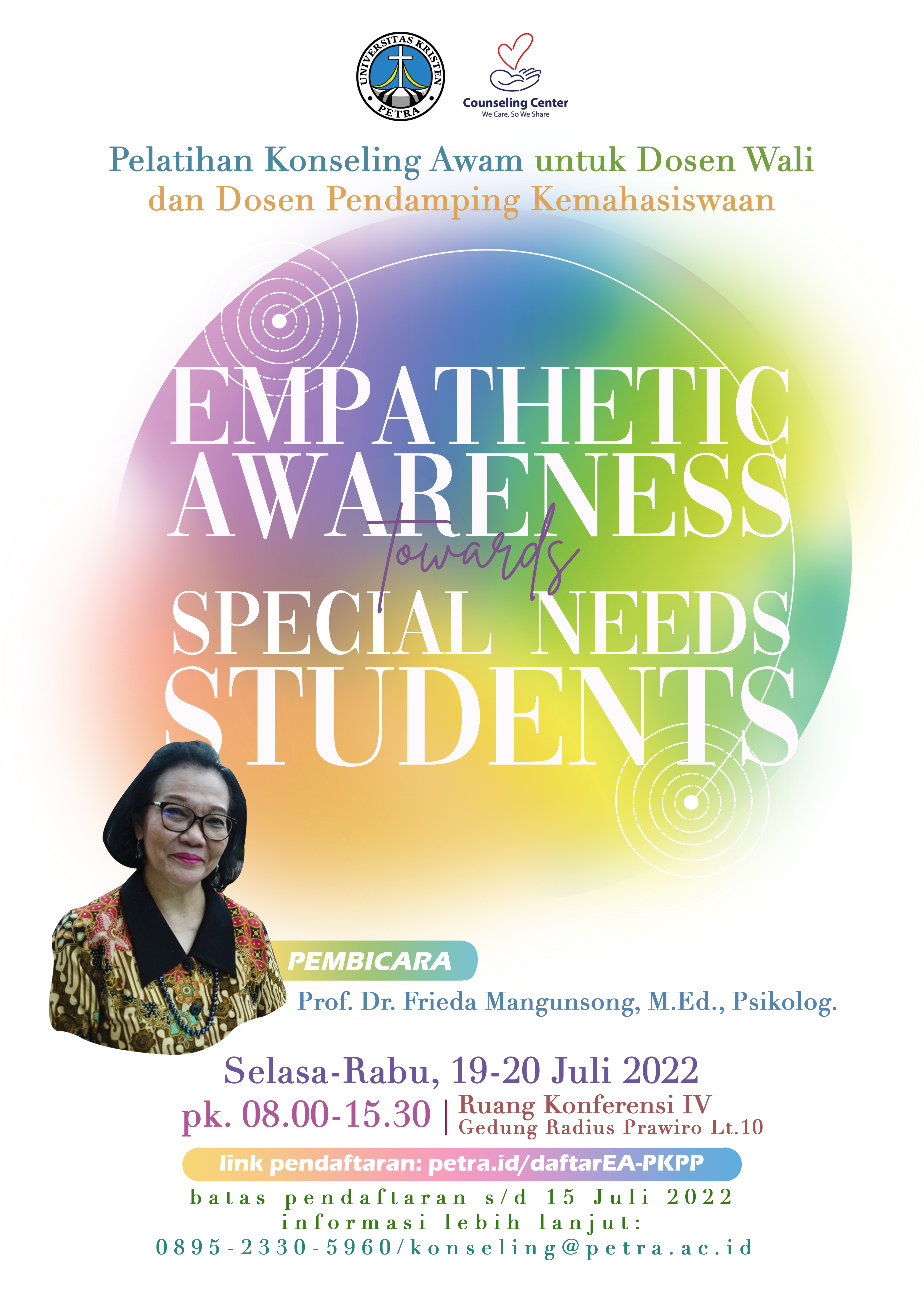 Pelatihan konseling awam untuk dosen wali dan dosen pendamping kemahasiswaan secara khusus tentang bagaimana memberikan PFA (pertolongan pertama psikologis) bagi mahasiswa yang berkebutuhan khusus/memiliki problem psikologis. Acara ini diadakan oleh Pusat Konseling dan Pengembangan Pribadi UK Petra pada tanggal 19-20 Juli 2022 Jam 08.00 - 15.30 WIB bertempat di Ruang Konferensi IV gedung Radius Prawiro lantai 10. Dengan menghadirkan Prof. Dr. Frieda Mangunsong, M.Ed.,Psikolog.