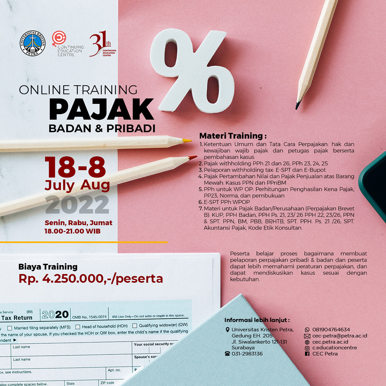 Program Pendidikan Profesional Berkelanjutan Universitas Kristen Petra Surabaya mengadakan online training pajak badan dan pribadi. Program ini dilaksanakan pada 18 Juli - 08 Agustus 2022. Biaya training sebesar Rp.4.250.000,-