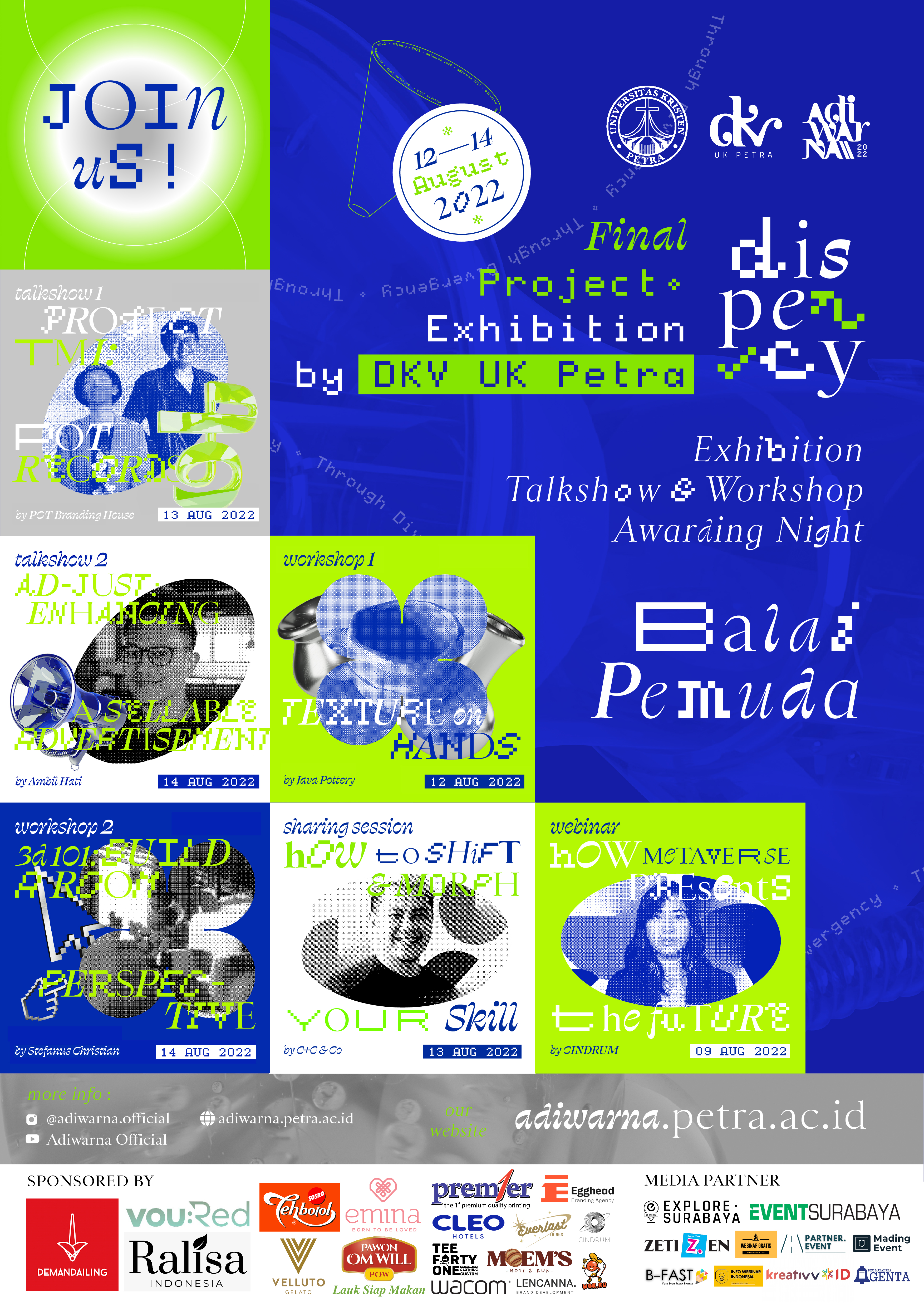 Pameran Tugas Akhir Adiwarna 2022 bertujuan menjadi sebuah wadah dan Sebuah ajang publikasi mengenai keunggulan mahasiswa DKV UK Petra angkatan 2018 yang dibagi menjadi 3 leap yaitu Creative Industry Internship, Research and Innovation,dan Community Engagement . CII adalah proses magang di industri kreatif, Ri adalah perancangan melalui riset dan membuat inovasi produk, dan ce adalah tugas akhir pemberdayaan komunitas . Selain bermanfaat untuk masyarakat karya tugas akhir ini juga mengikuti perkembangan teknologi.
