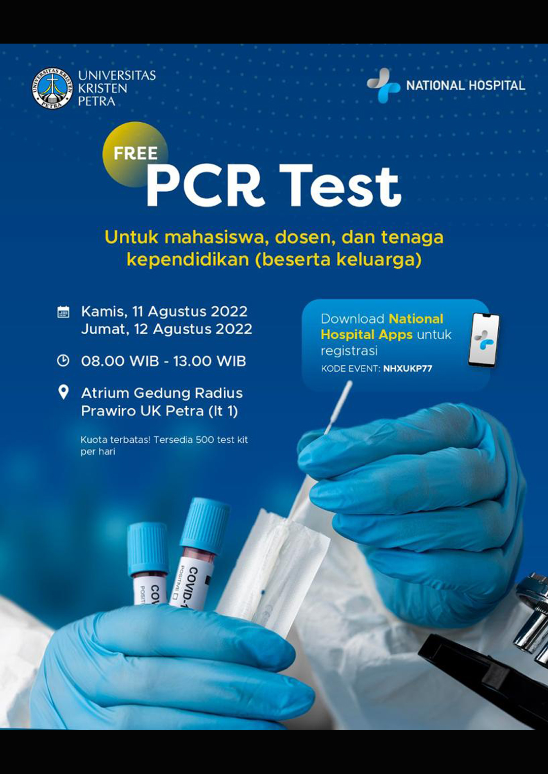 Universitas Kristen Petra Surabaya bekerjasama dengan National Hospital dalam melaksanakan tes PCR secara gratis. Acara ini berlangsung pada 11-12 Agustus 2022 jam 08.00 - 13.00 WIB bertempat di Atrium Gedung Radius Prawiro.