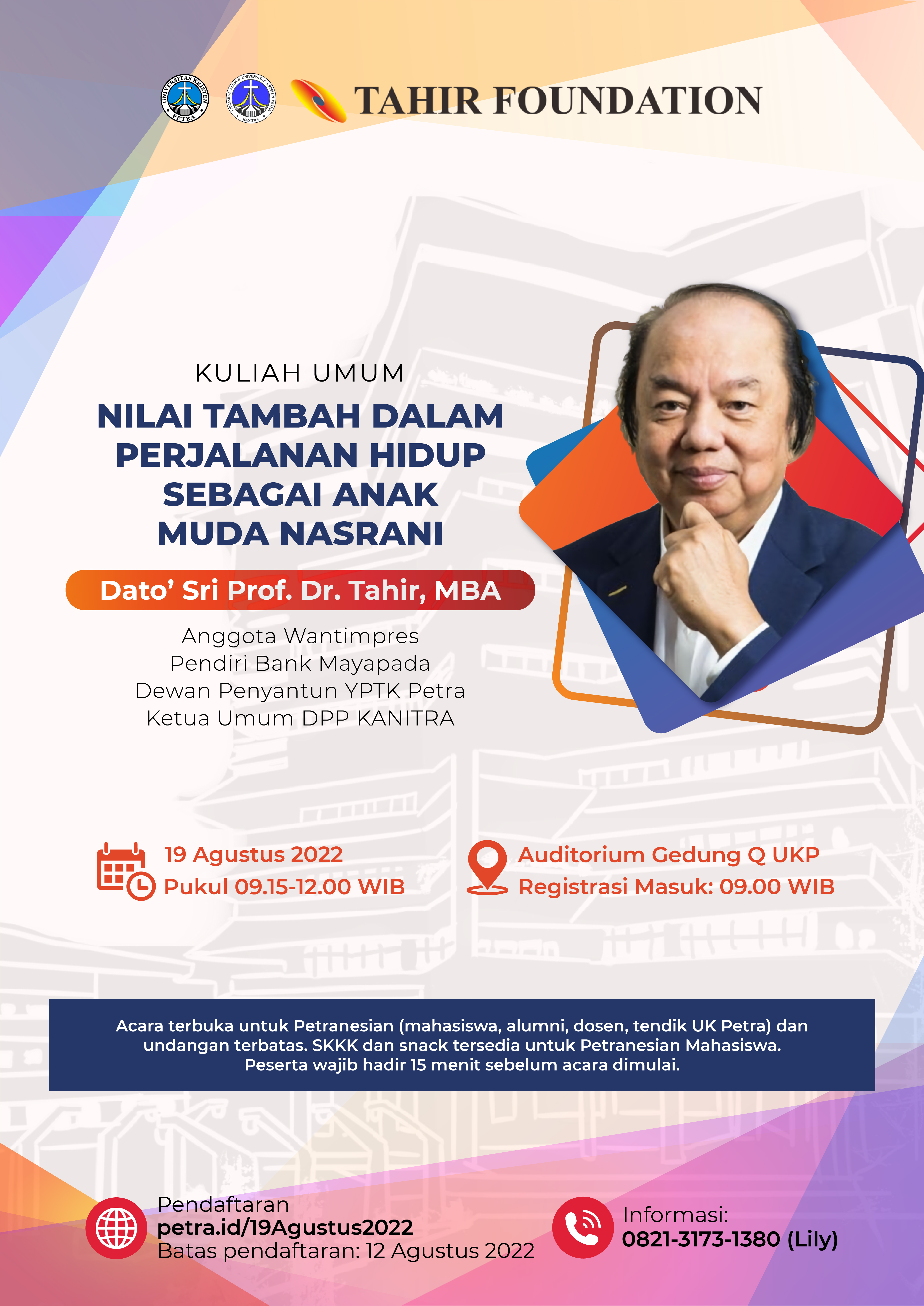 Kuliah Umum yang istimewa akan menghadirkan Dato’ Sri Prof. Dr. Tahir, MBA di UK Petra. Topik yang akan dibahas adalah nilai tambah dalam perjalanan hidup sebagai anak muda Nasrani