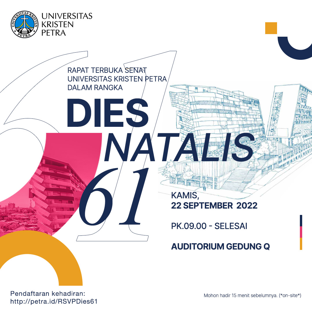 Rapat terbuka senat Universitas Kristen Petra Surabaya dalam rangka Dies Natalis ke-61 UK Petra, dilaksanakan pada Kamis, 22 September 2022 bertempat di Auditorium gedung Q.