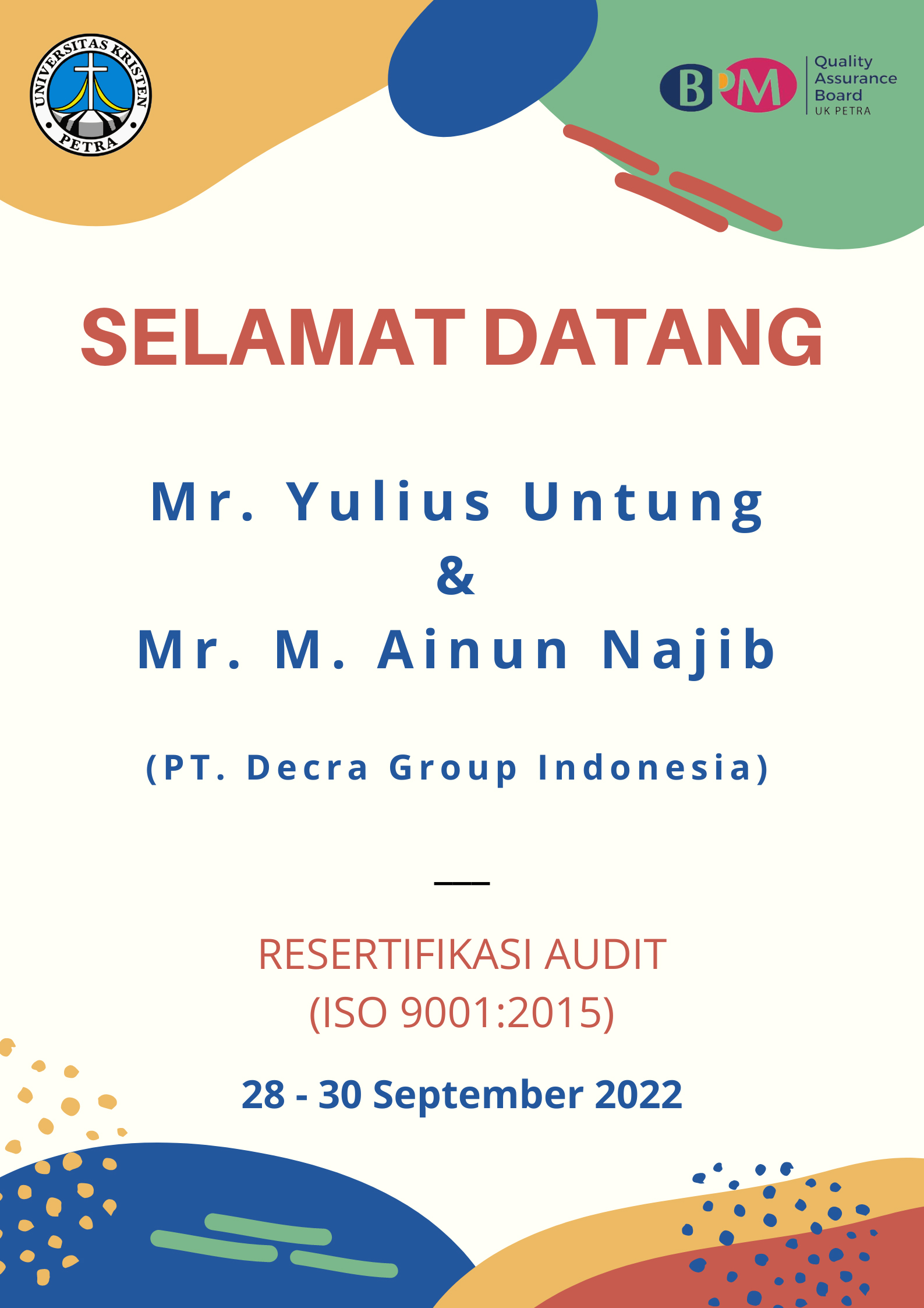 Ucapan selamat datang untuk para auditor yang datang pada acara pelaksanaan resertifikasi Audit Eksternal 28-30 September 2022 di kampus UK Petra Surabaya