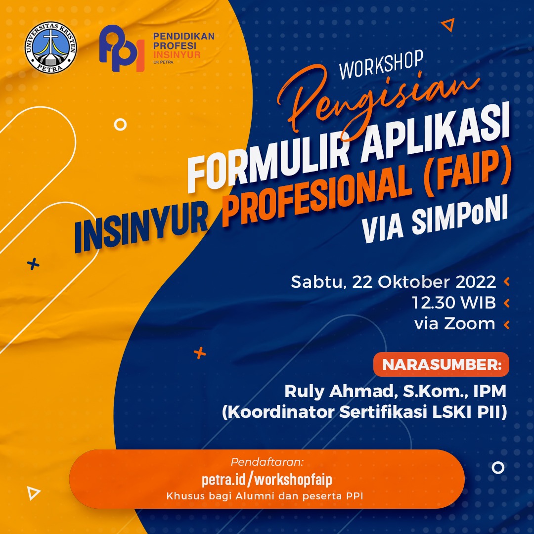 Program Pendidikan Profesi Insinyur Universitas Kristen Petra Surabaya mengadakan acara Workshop Pengisian FAIP (formulir aplikasi insinyur profesional). Acara ini dilaksanakan pada tanggal 22 Oktober 2022 jam 12.30 - selesai secara online melalui aplikasi Zoom. Dengan menghadirkan Rully Ahmad, S.Kom. sebagai narasumber.