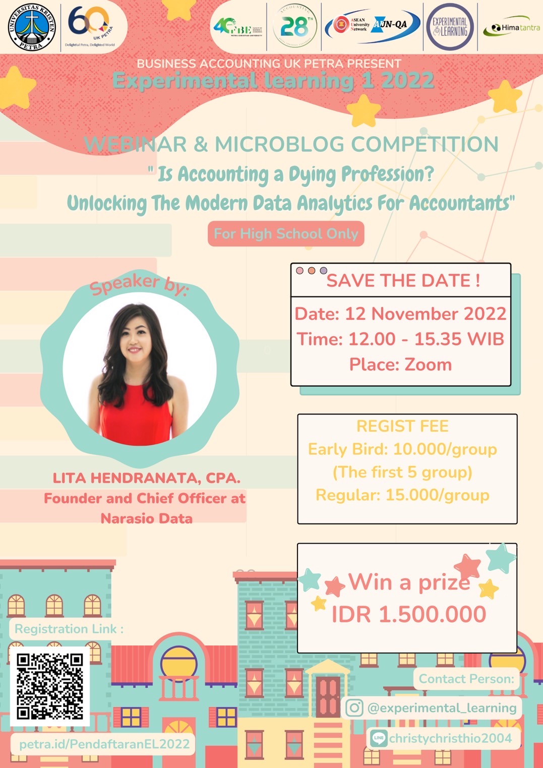 Kegiatan Experimental Learning mengangkat tema “Is Accounting a Dying Profession? Unlocking The Modern Data Analytics For Accountans” dengan konsep webinar dan microblog competition. Tujuannya agar peserta yaitu siswa/i SMA dapat mengetahui pentingnya data analytics bagi seorang akuntan dan dapat meningkatkan kreativitas dan inovasi secara kritis melalui karya microblog. Acara ini akan berlangsung pada 12 November 2022, dengan narasumber Lita Hendranata, CPA.