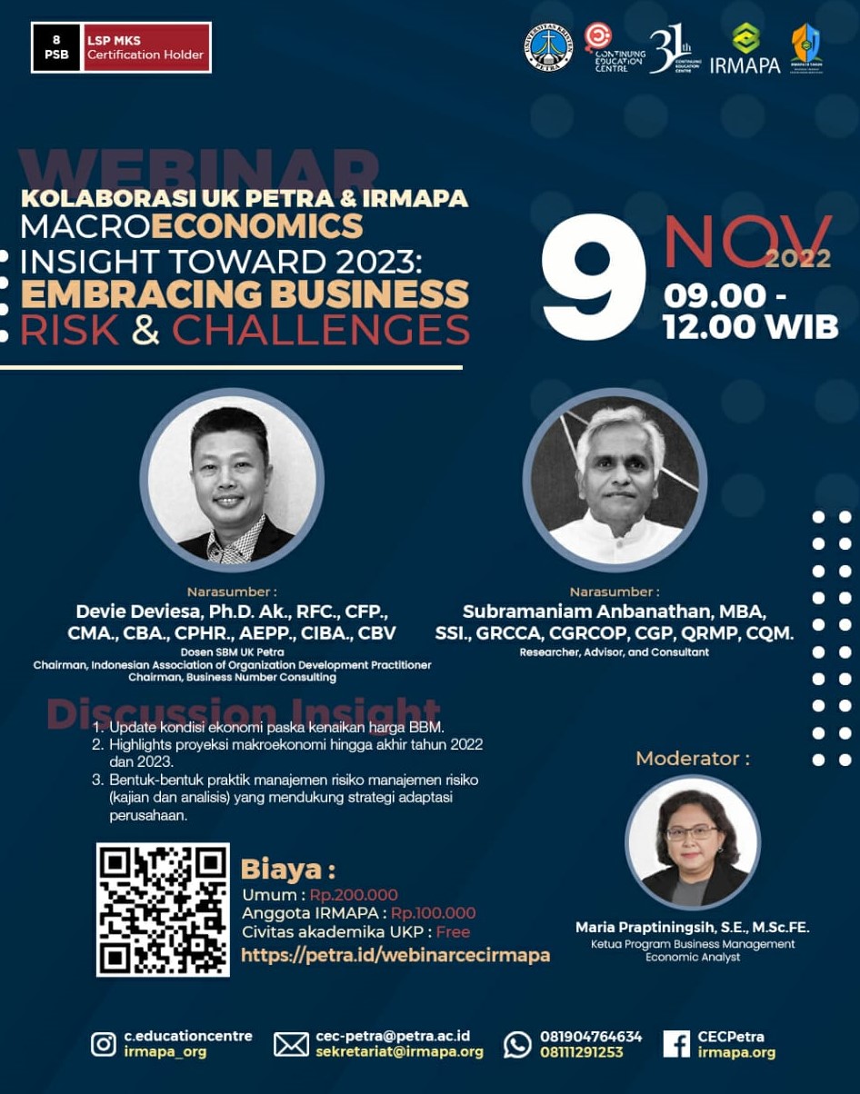UK Petra berkolaborasi dengan Irmapa mengadakan seminar: Macro economics insight towards 2023 : embracing business risk & challenges. Dengan narasumber Devie, Ph.D., dan Subramaniam Anbanatham, MBA. Acara ini dilaksanakann pada tanggal 09 November 2022 jam 09.00 - 12.00 WIB