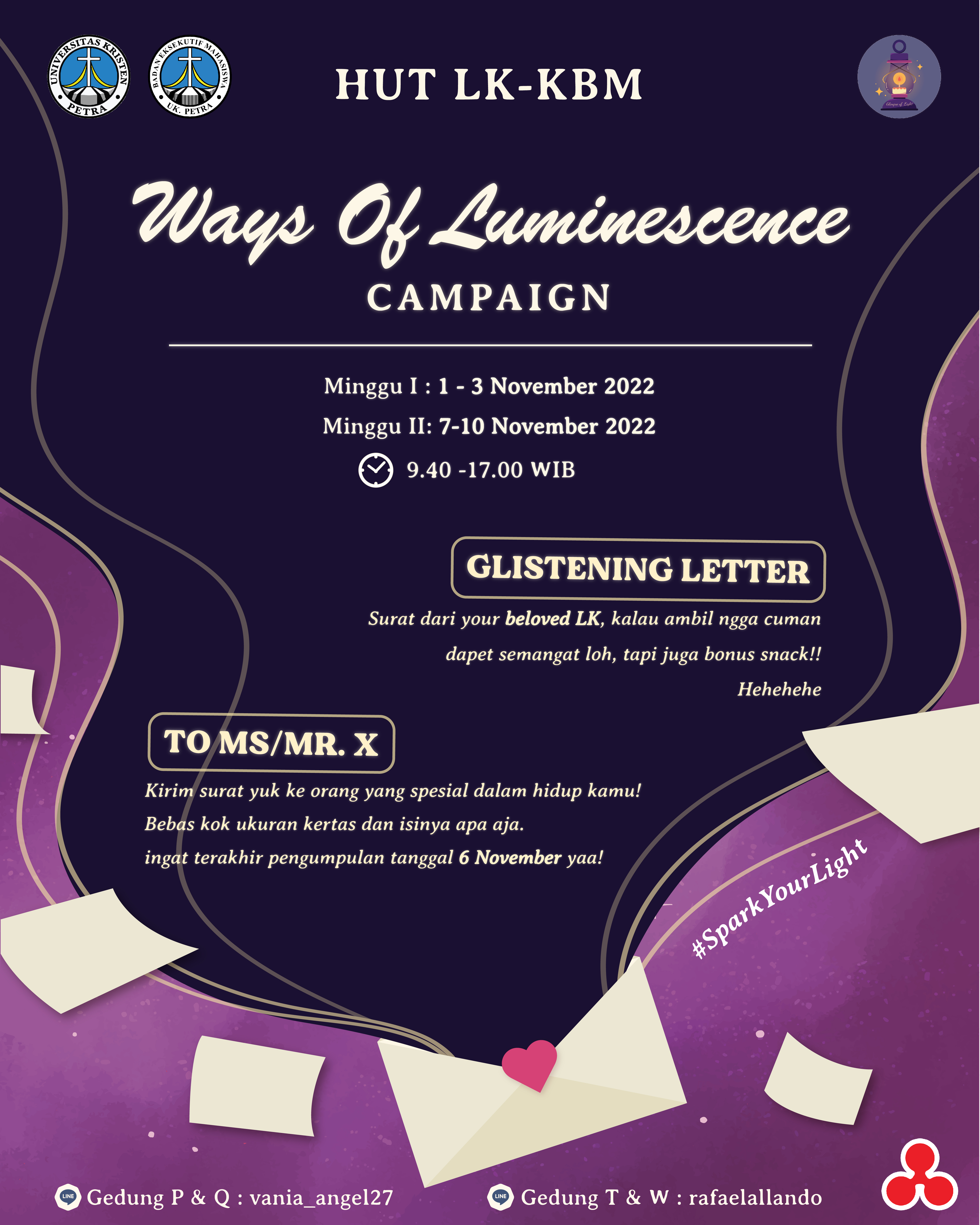 Kampanye HUT LK-KBM tahun 2022, banyak acara yang akan digelar oleh Badan Eksekutif Mahasiswa UK Petra. Dimulai dari tanggal 1-10 November 2022.