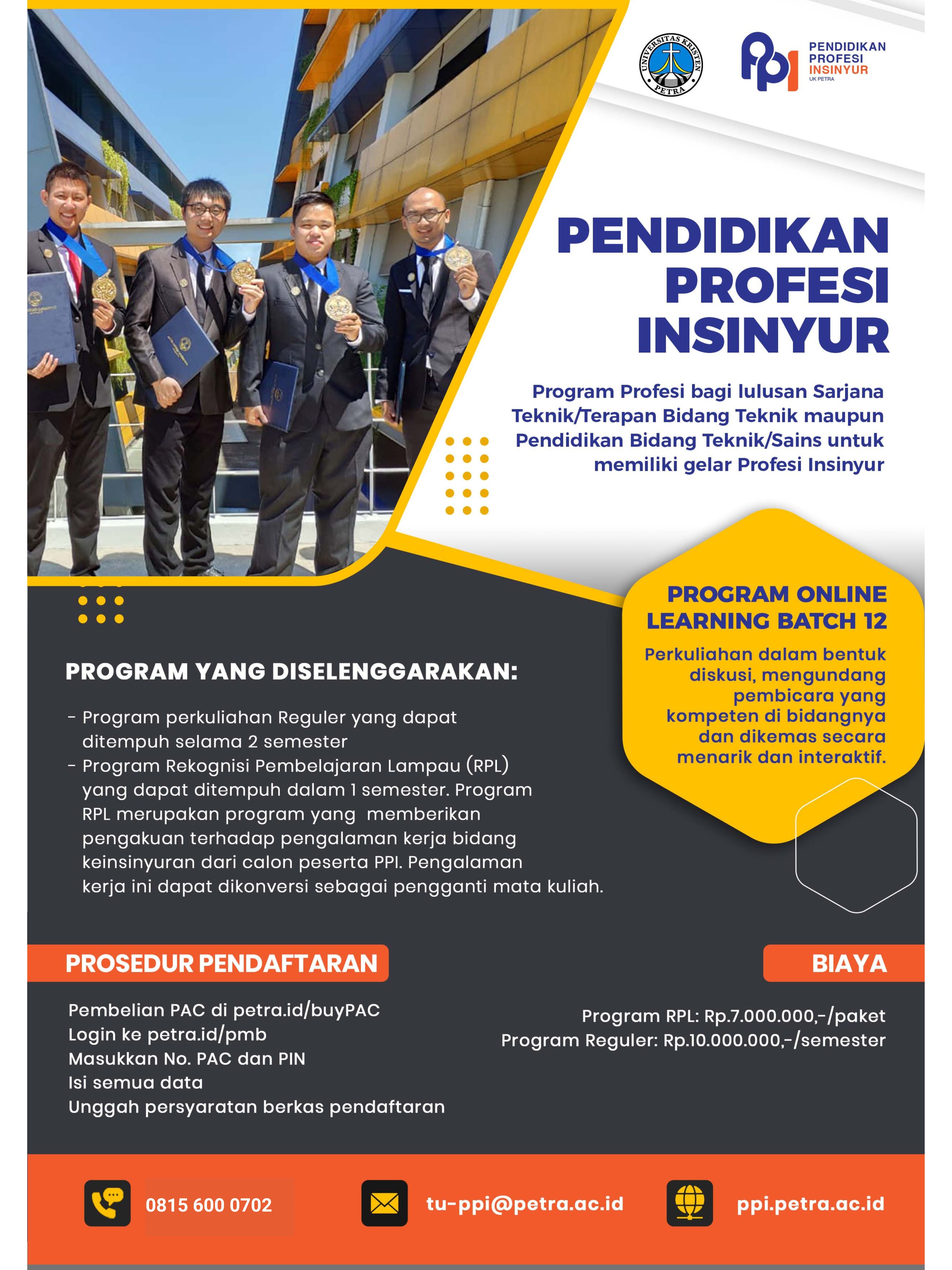 Pendidikan Profesi Insinyur Universitas Kristen Petra Surabaya membuka pendaftaran mahasiswa baru semester genap tahun 2023. Info lebih lengkap silahkan lihat di ppi.petra.ac.id
