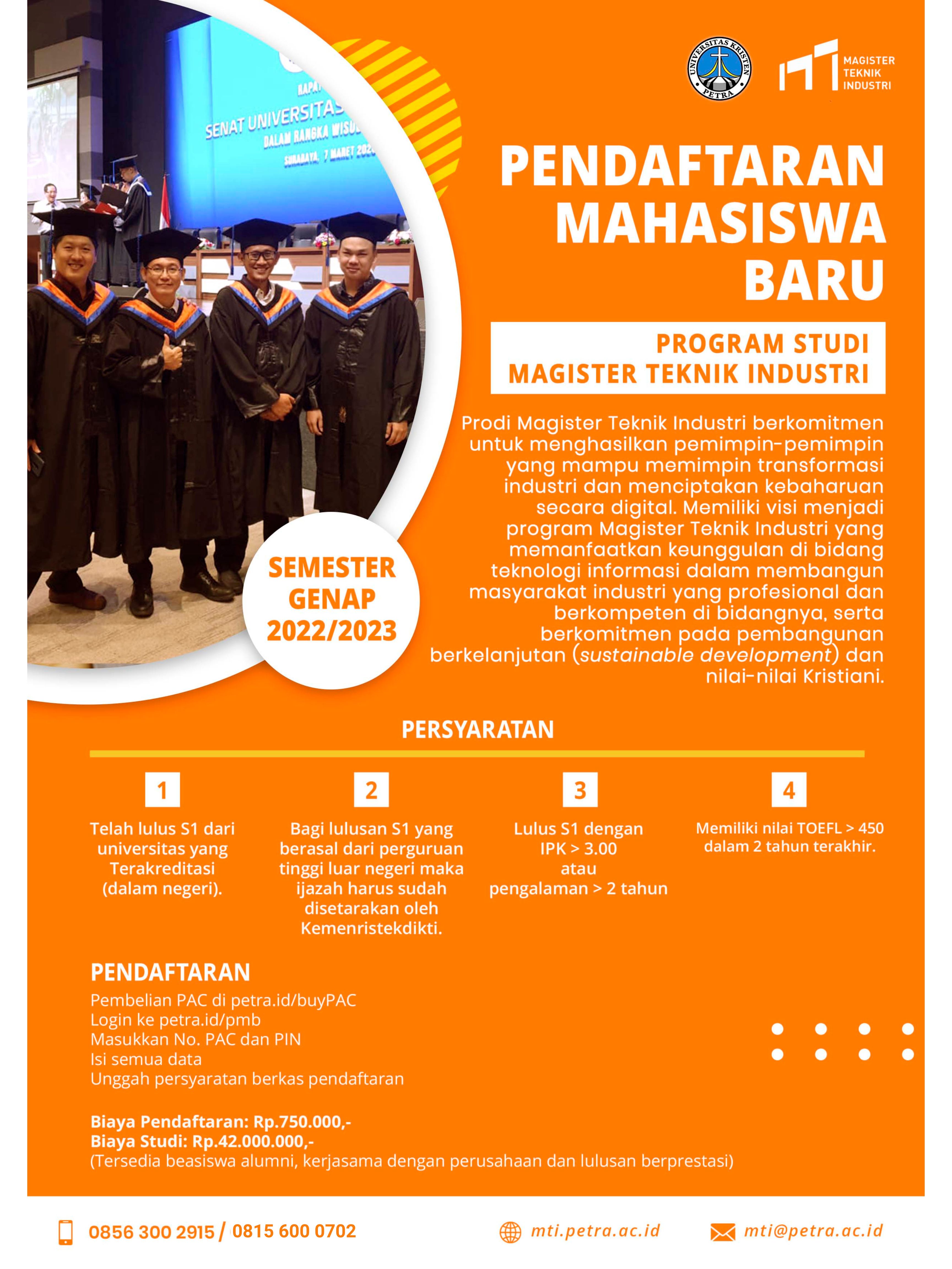 Program Studi Magister Teknik Industri Universitas Kristen Petra Surabaya membuka pendaftaran mahasiswa baru semester genap tahun 2022/2023. Info lengkapo ada di mti.petra.ac.id