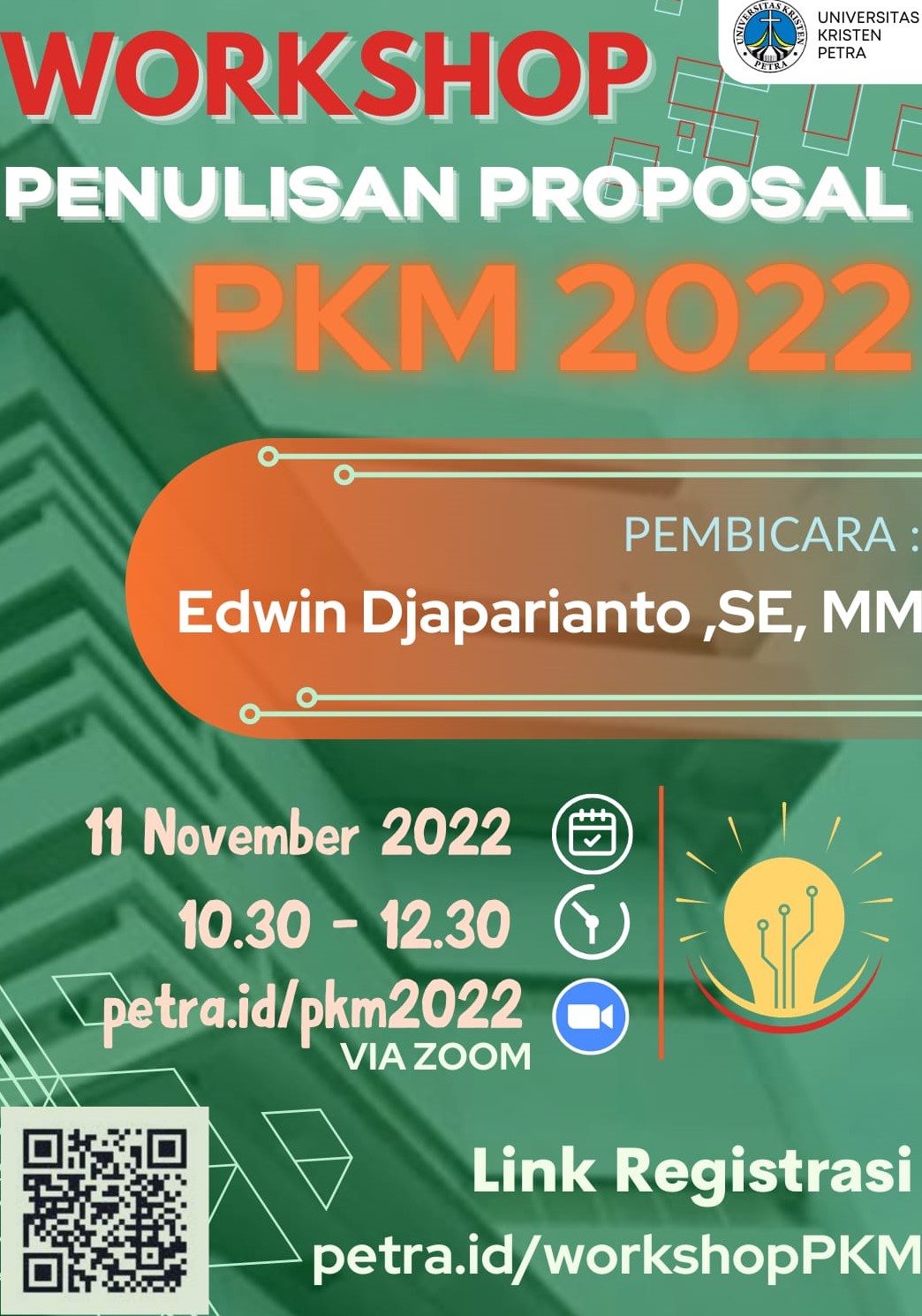 Biro Administrasi Kemahasiswaan dan Alumni UK Petra Surabaya pada tanggal 11 November 2022 jam 10.30 - 12.30 WIB mengadakan acara Workshop penulisan proposal PKM 2022. Dengan narasumber bapak Edwin Djaparianto, S.E., M.M.
