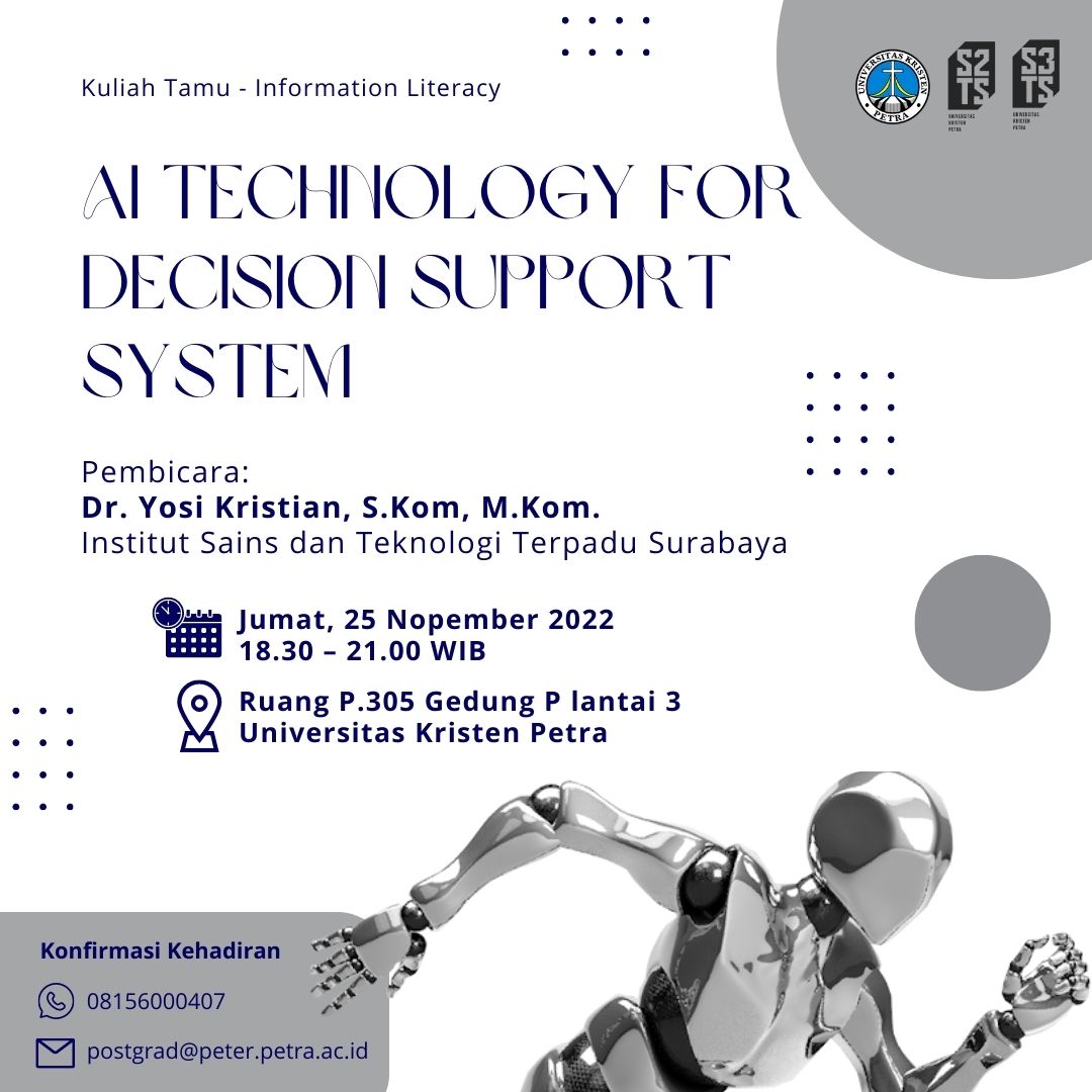 Magister Teknik Sipil Universitas Kristen Petra Surabaya pada tanggal 25 November 2022 jam 18.30 - 21.00 WIB mengadakan acara kuliah tamu dengan topik AI technology for decision support system. Dengan narasumber Dr. Yosi Kristian, S.Kom., M.Kom.