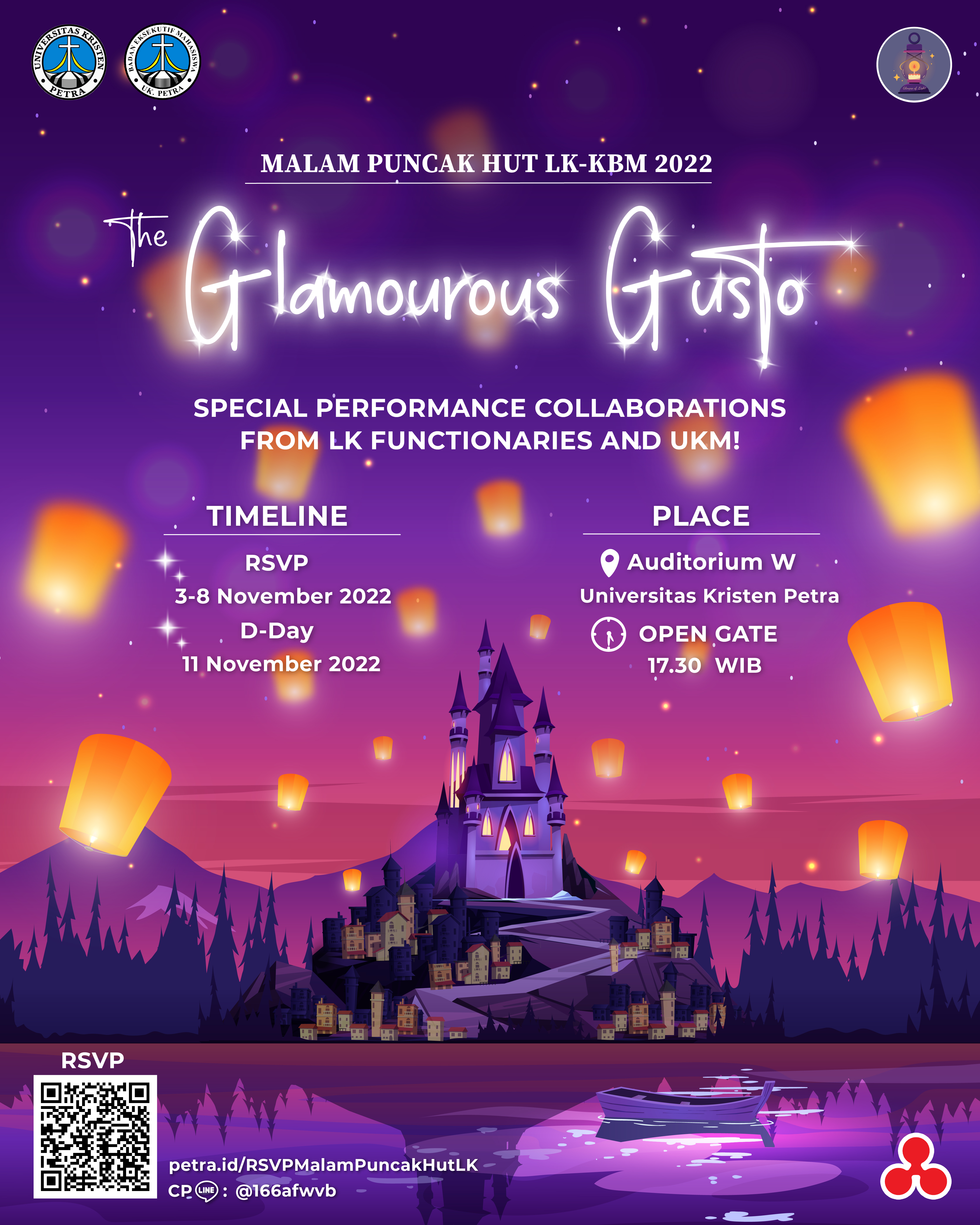11 November 2022 jam 17.30 - selesai Badan Eksekutif Mahasiswa Universitas Kristen Petra Surabaya menggelar acara malam puncak HUT LK-KBM 2022 yang diadakan di Auditorium kampus pusat.