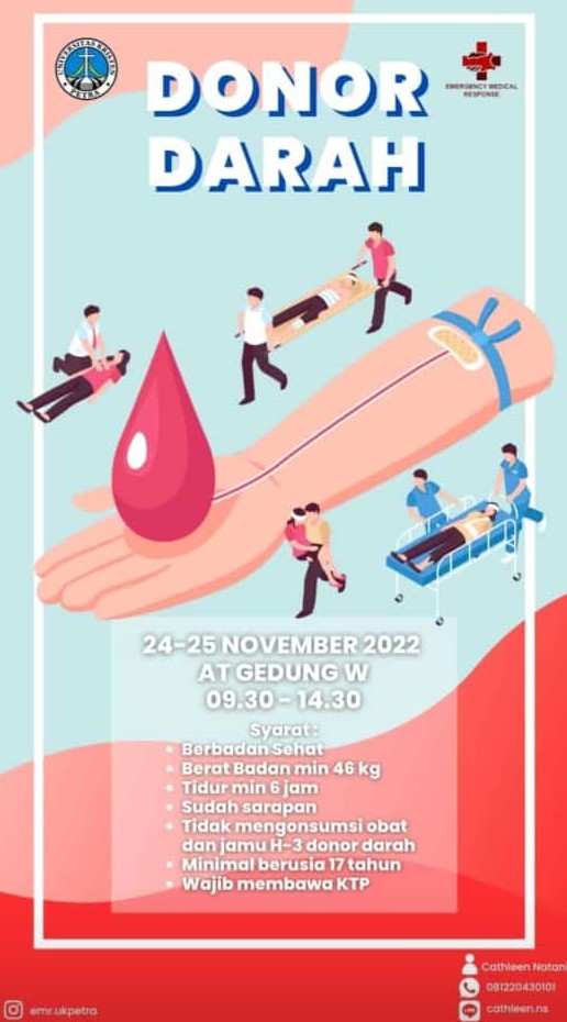 Pada tanggal 24-25 November 2022, jam 09.30 - 14.30 WIB bertempat di Atrium gedung Radius Prawiro Universitas Kristen Petra Surabaya, akan dilaksanakan donor darah.