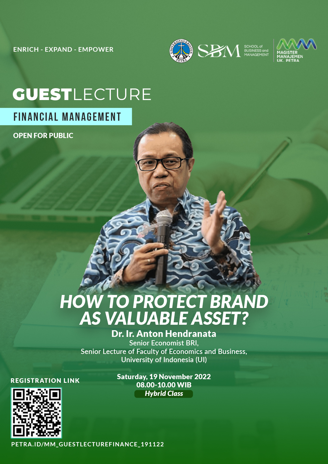 Kuliah tamu finance: how to protect brand as valuable asset? dengan narasumber Dr. Ir., Anton Hendranata akan diadakan oleh Program Studi Magister Manajemen UK Petra. Pada tanggal 19 November 2022 jam 08.00 - 10.00 WIB.