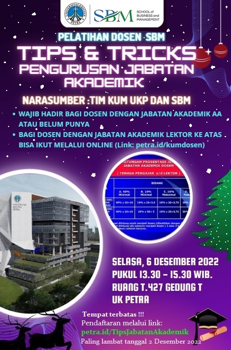 Pada tanggal 06 Desember 2022 jam 13.30 - 15.30 WIB bertempat di gedung T.427 Program Studi Manajemen UK Petra mengadakan pelatihan tips dan trick pengurusan jabatan akademik bagi dosen-dosen yang mempunyai jabatan akademik Asisten Ahli atau dan belum mempunyai jabatan akademik oleh Tim KUM UKP dan SBM.
