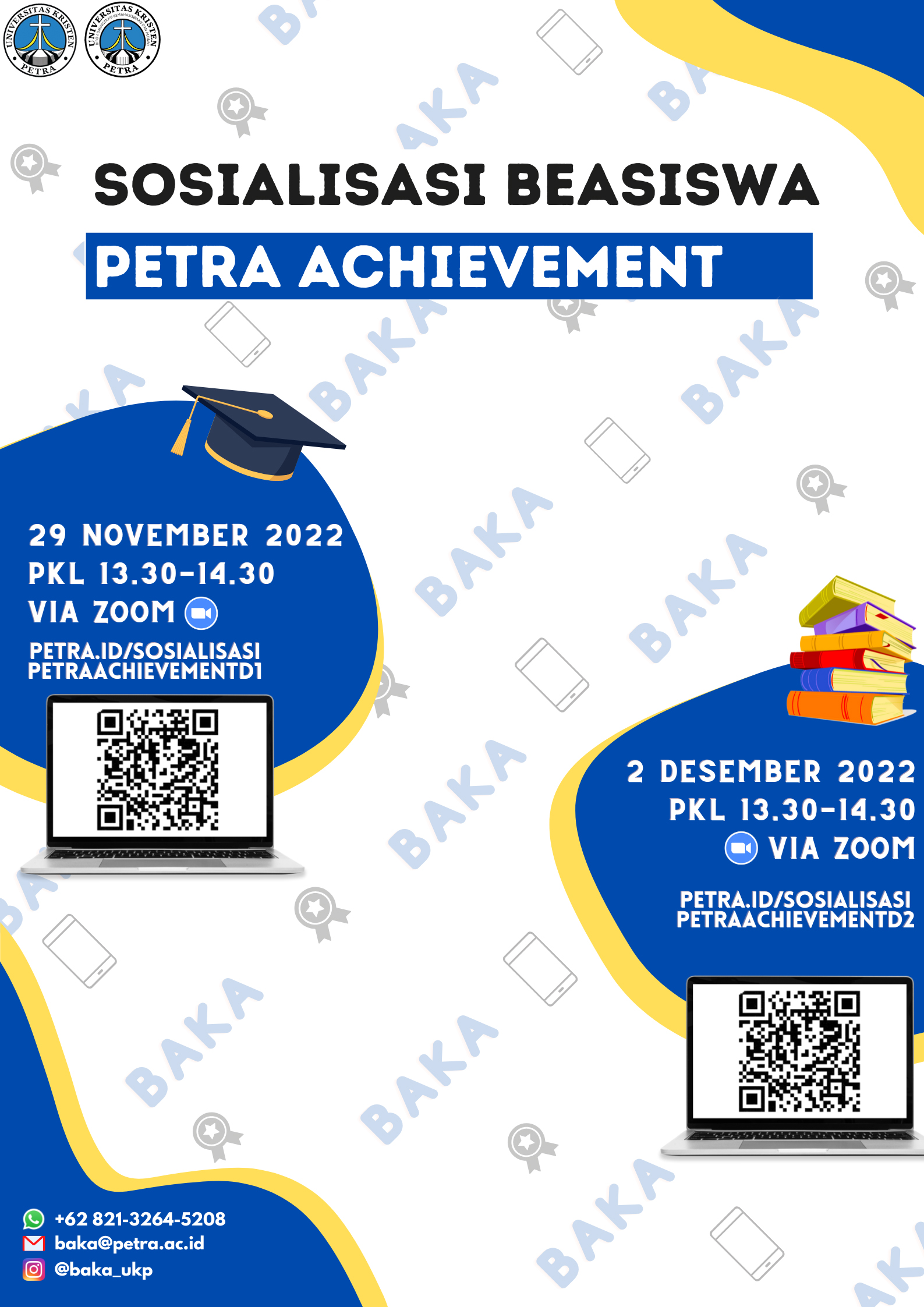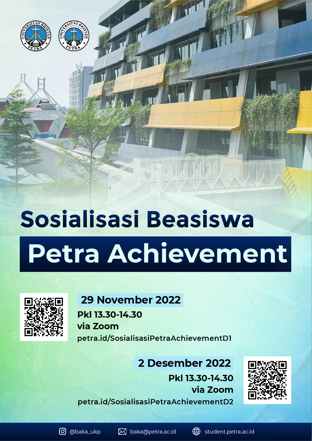 Sosialisasi dan promosi Beasiswa Petra achievement tahun anggaran 2023/2024, dilaksanakan pada tanggal 29 November dan 2 Desember 2022. Dilaksanakan secara online melalui Zoom meeting.