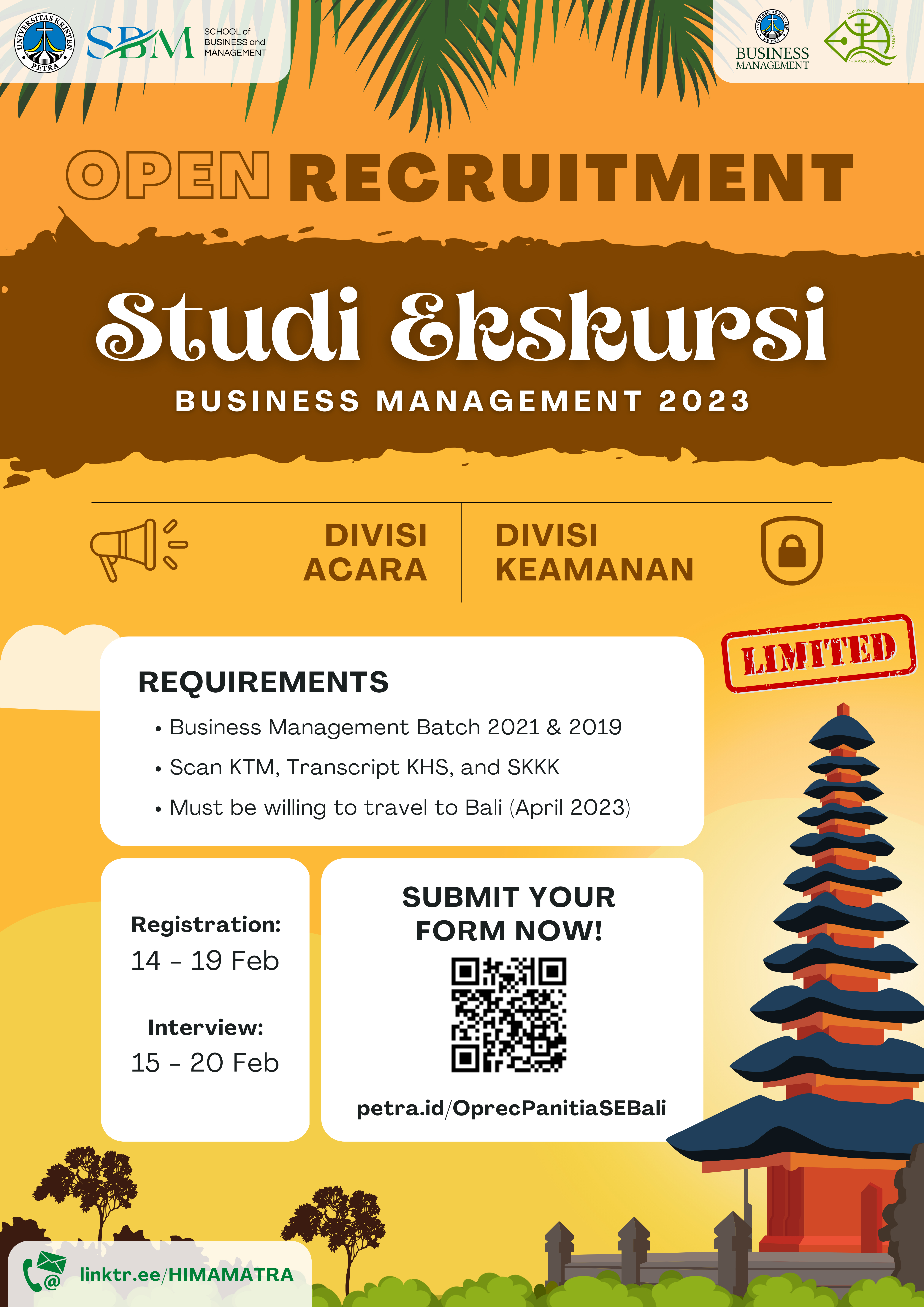 Untuk kesuksesan penyelenggaraan Studi Ekskursi Business Management 2023, telah dibuka pendaftaran panitia. Untuk info lebih lengkap klik petra.id/OprecPantiaSEBali