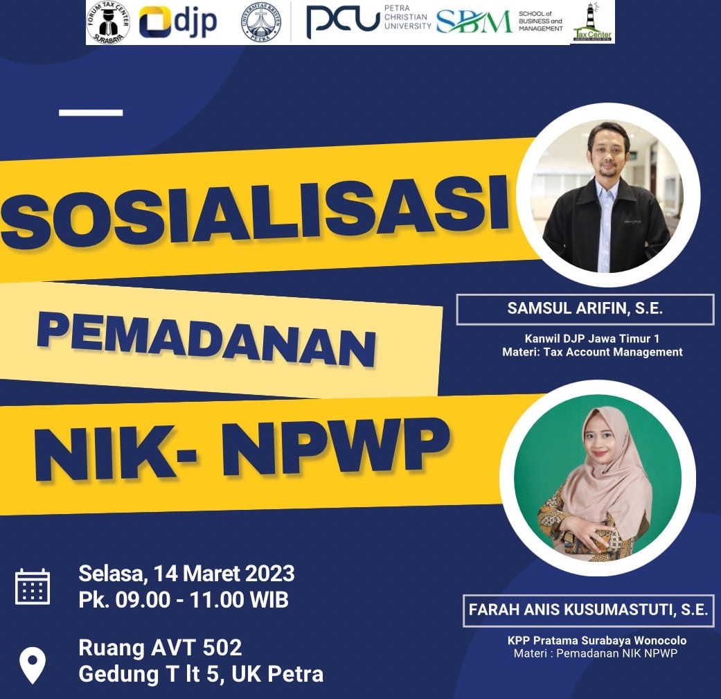 Program pemerintah yang akan diberlakukan mulai 1 Jan 2024 dimana NPWP akan dihapus dan berubah menjadi NIK. Untuk itu Program Akuntansi Pajak UK Petra Surabaya mengadakan sosialisasi tentang program pemerintah tersebut. Acara sosialisasi dilaksanakan pada tanggal 14 Maret 2023, bertempat di AV.T.502