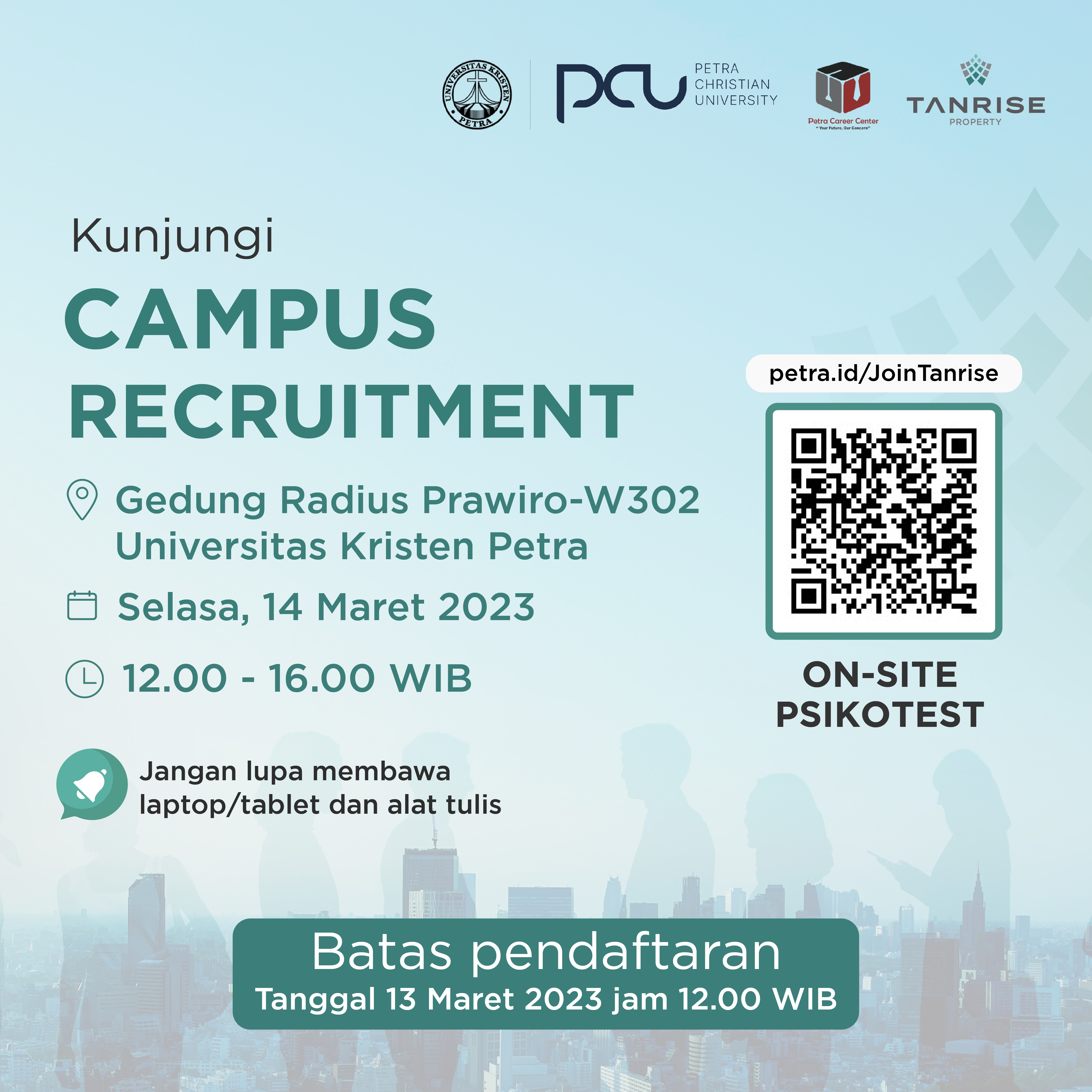 Pusat Karir Universitas Kristen Petra Surabaya bekerja sama dengan Tanrise Property, mengadakan rekrutmen karyawan. Acara ini diselenggarakan pada 14 Maret 2023 jam 14.00 - 16.00 WIB, bertempat di Gedung Radius Prawiro W.302.