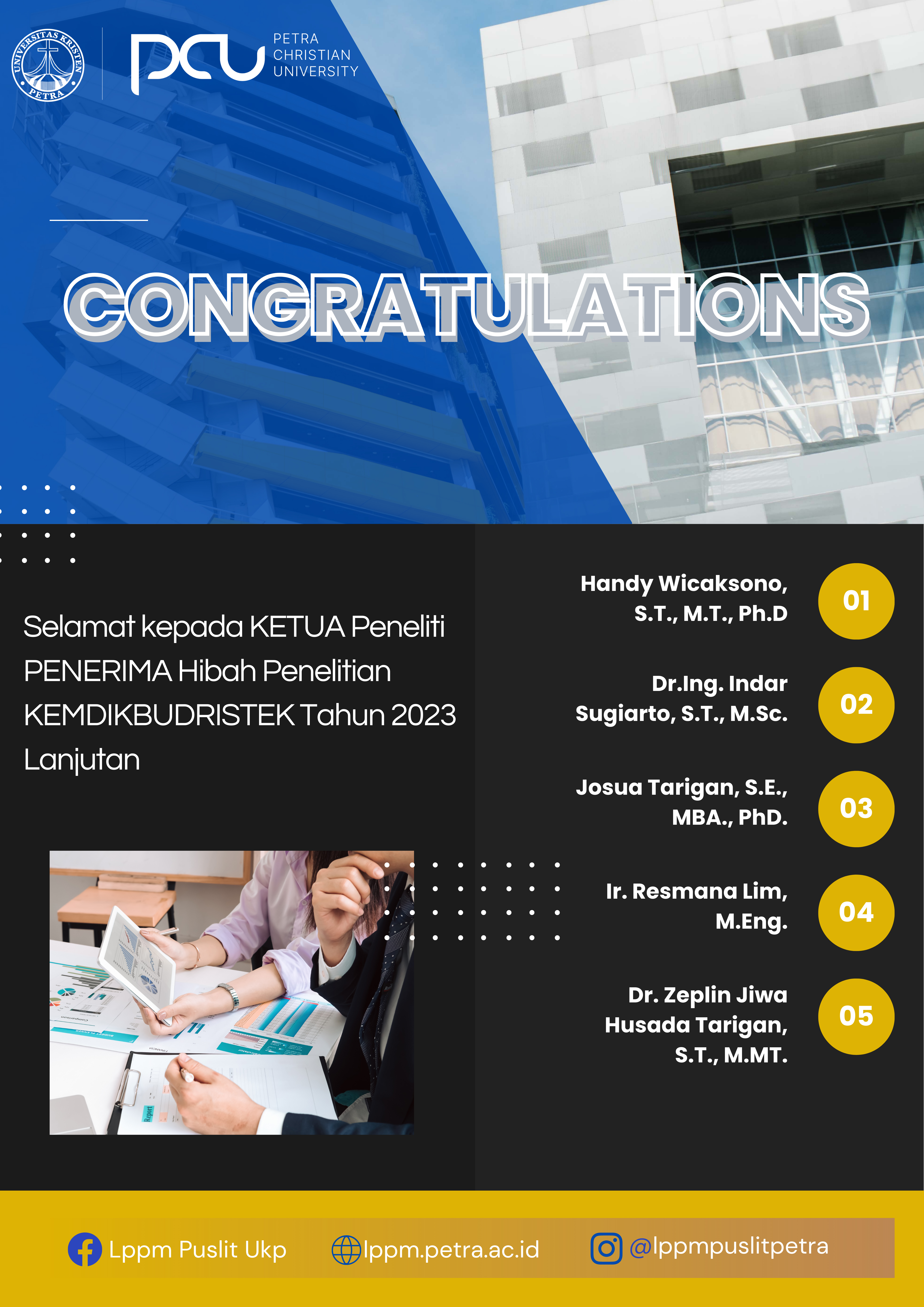 Kementrian Pendidikan dan Kebudayaan Riset dan Teknologi Republik Indonesia telah mengumumkan pemenang dana hibah tahun 2023. Untuk Universitas Kristen Petra Surabaya ada 5 dosen yang menjadi pemenang.